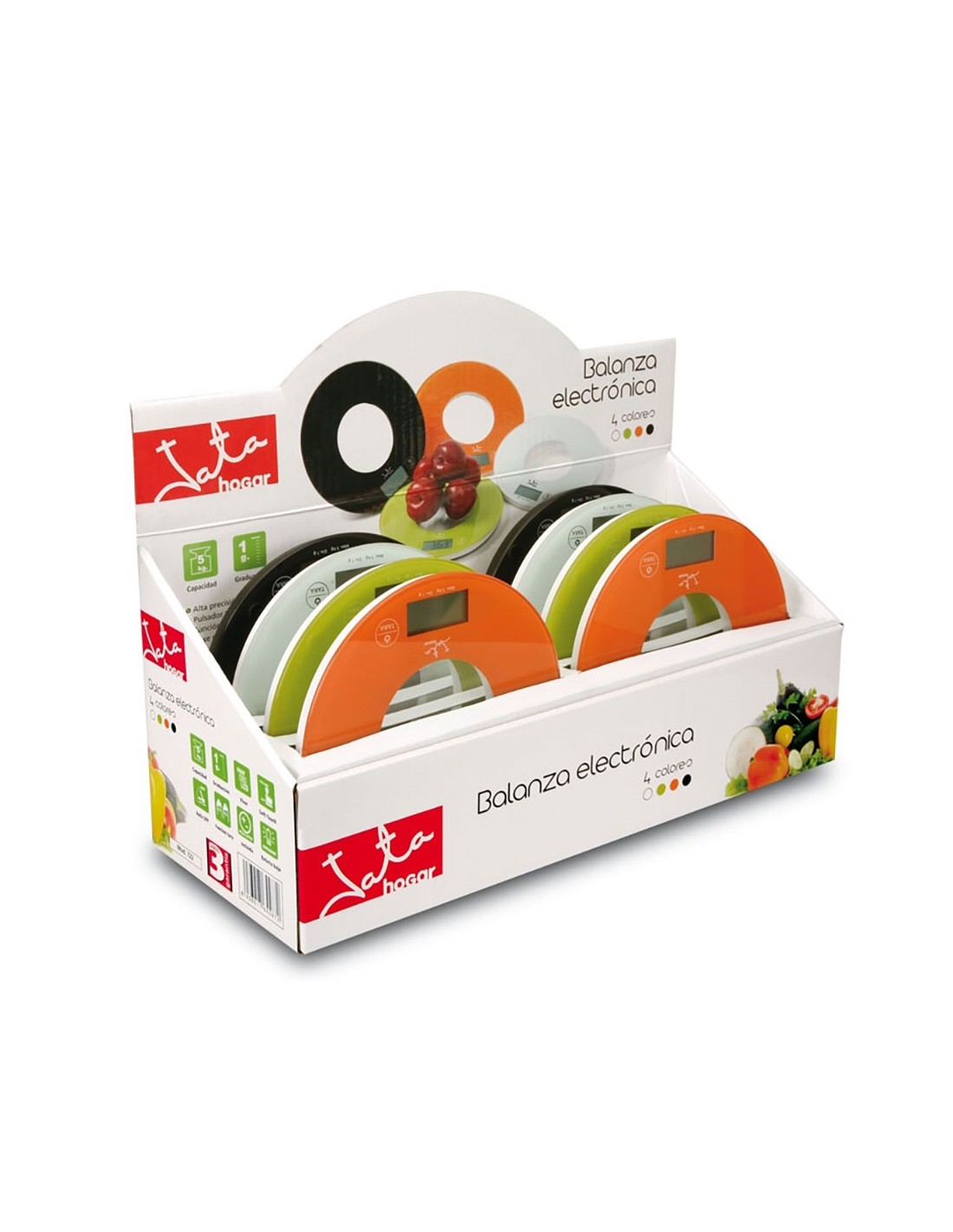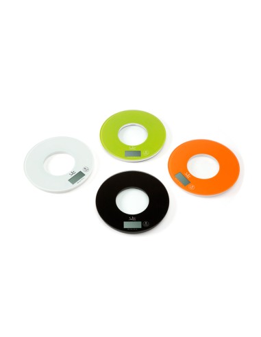 Balanza redonda con capacidad de hasta 5 kg. graduación 1 g. alta precisión electrónica. pulsador táctil. función de tara. base de cristal de seguridad "temperit". visor lcd de 4 dígitos. función de conversión kg/lb/ml. desconexión automática, indicador de batería baja. indicador de sobre peso. funciona con 1 pila de litio cr2032 (incluida). colores surtidos