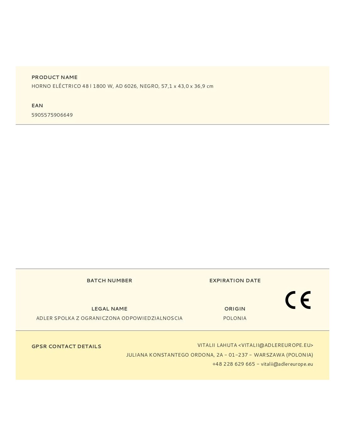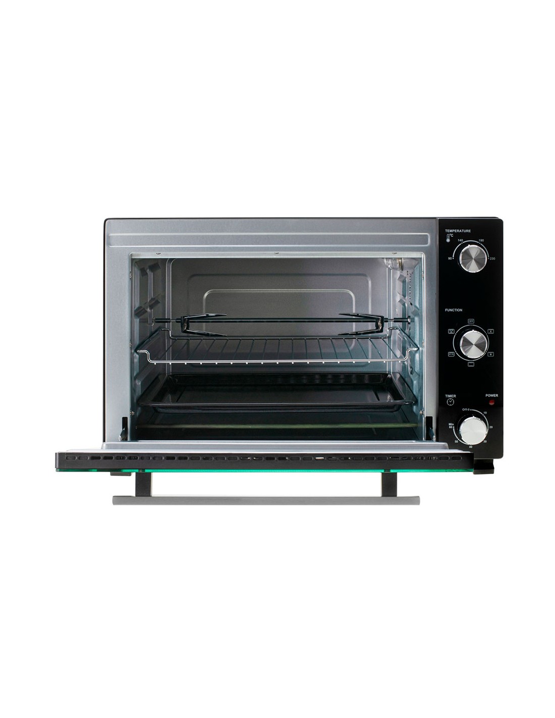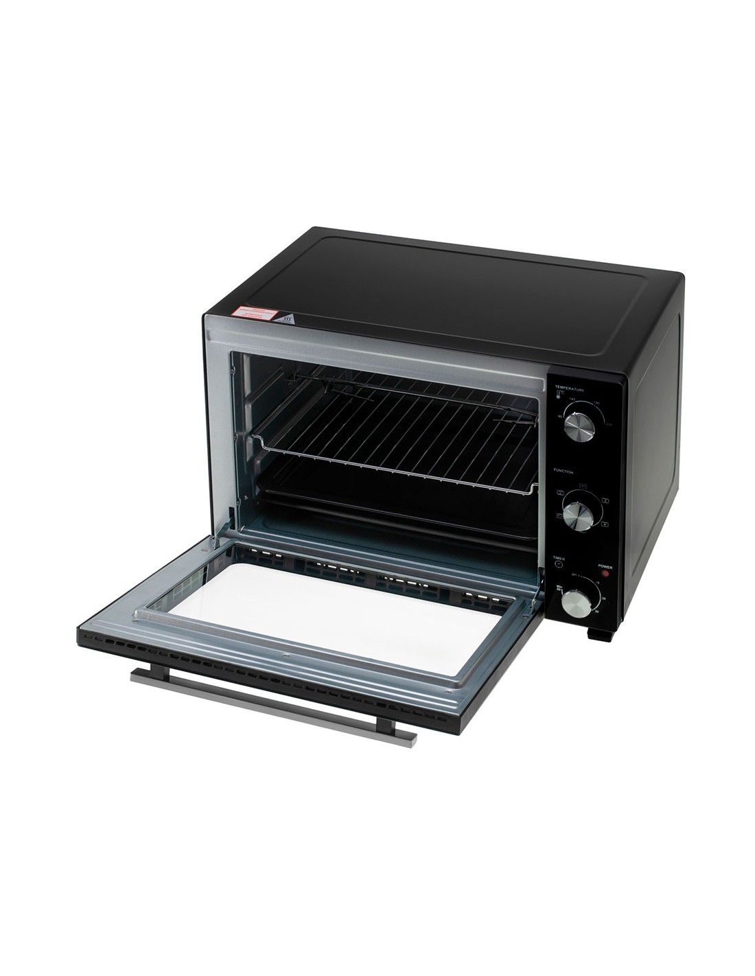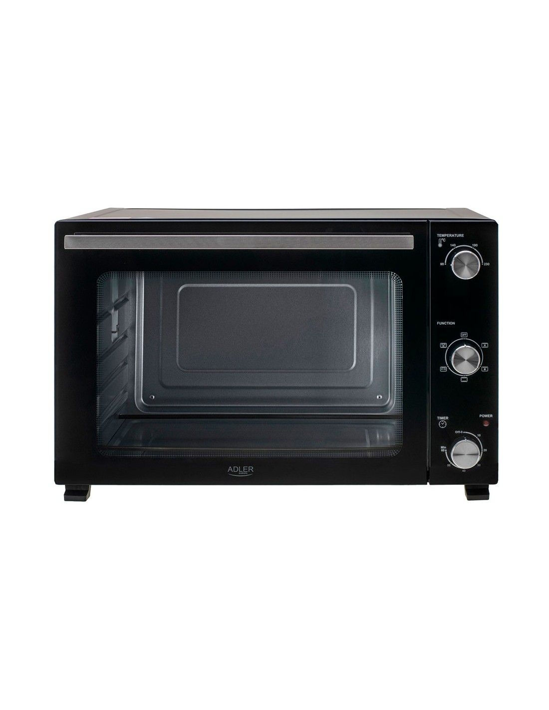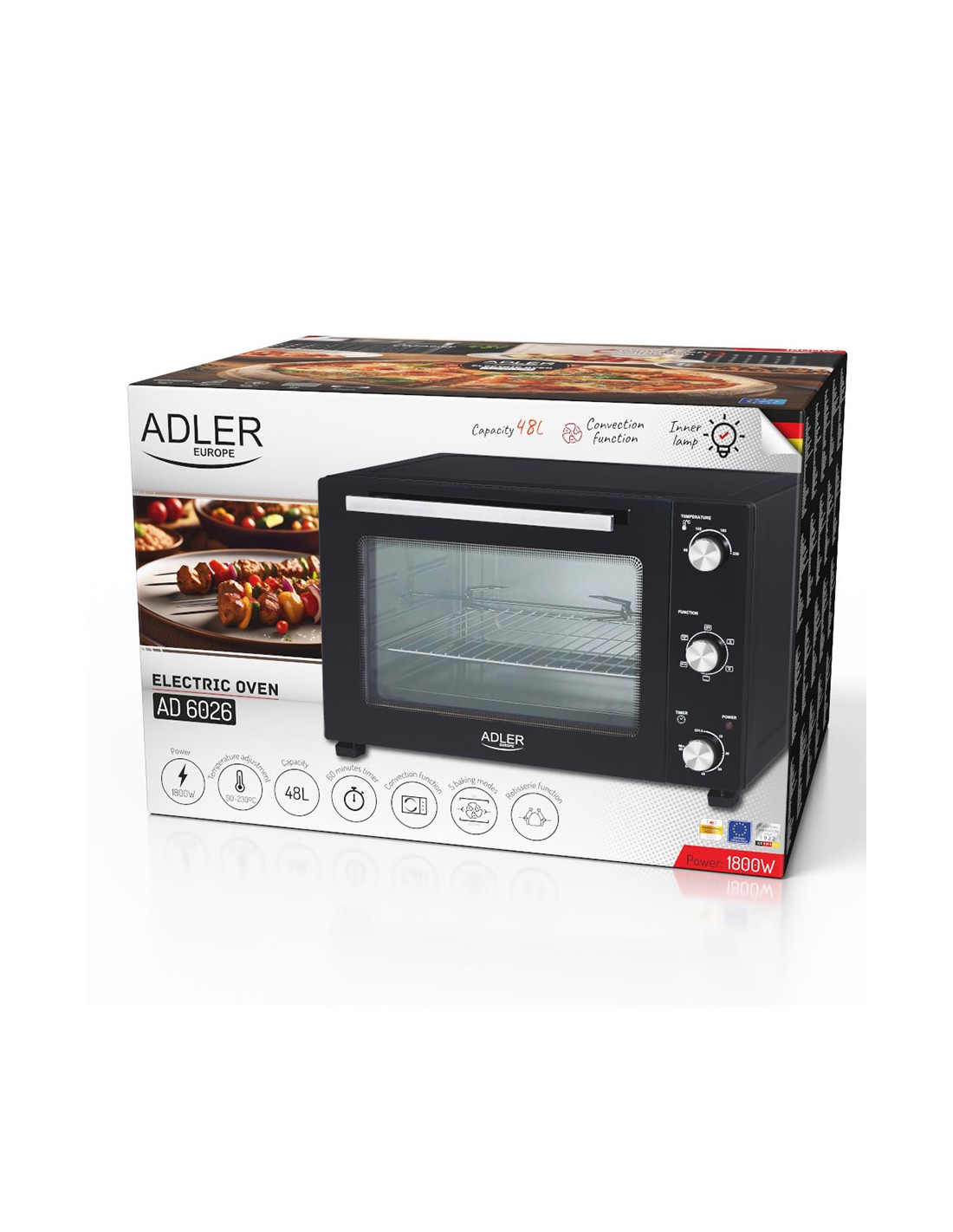 Horno eléctrico ad 6026, 1800 w, 48 l 2 funciones: convección y asador control de temperatura de 90 a 230°c, temporizador hasta 60 min con señal sonora, hecho de acero inoxidable 5 modos de horneado: calentador superior + inferior + convección, superior + convección, superior + inferior, superior + asador, superior + inferior + asador + convección iluminación interior, puerta de vidrio templado doble accesorios: rejilla para hornear, bandeja hornear, asa para bandeja, asador para bandeja y asador cable 92 cm 220-240 v ~50/60 hz dimensiones externas 57,1 x 43,0 x 36,9 cm, internas 42,5 x 36 x 30 cm