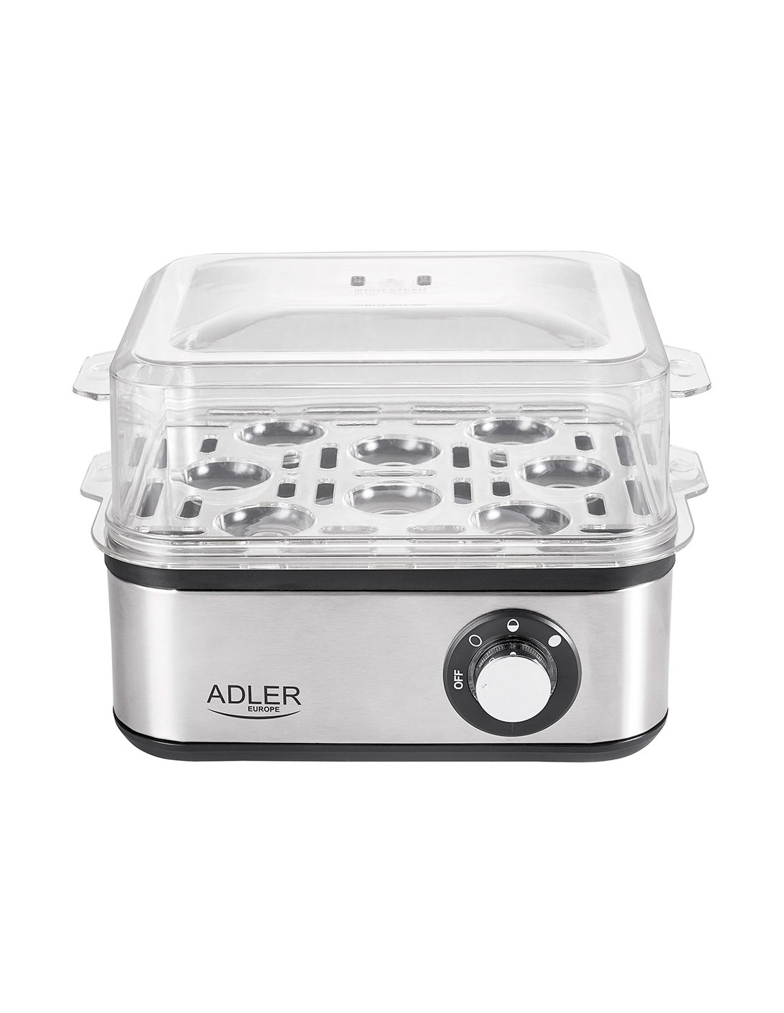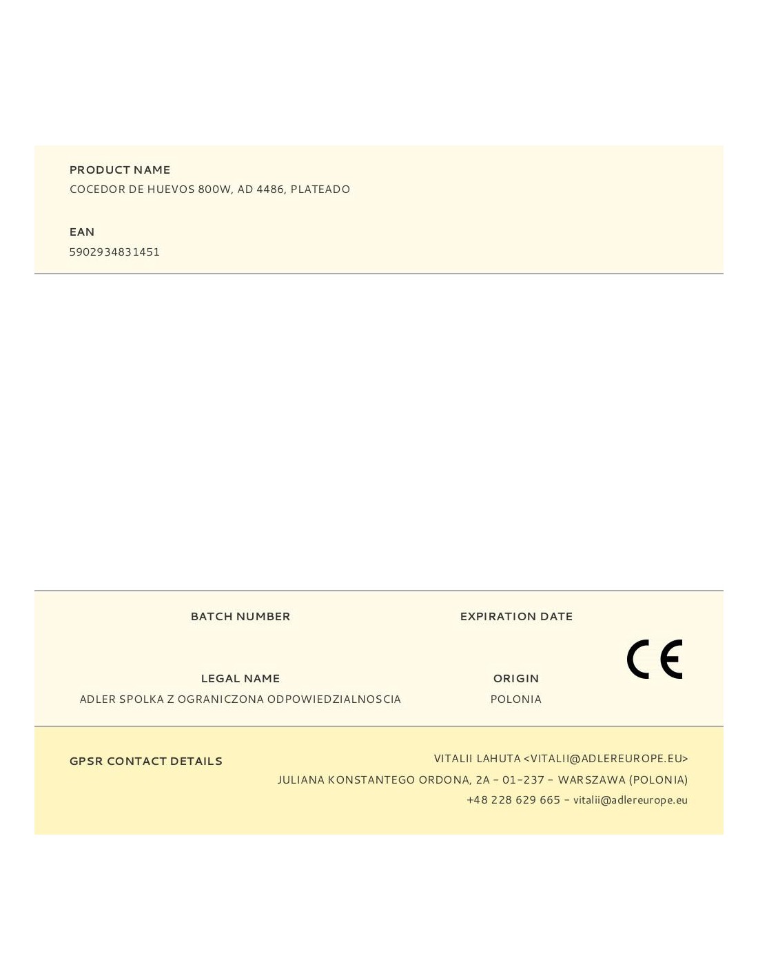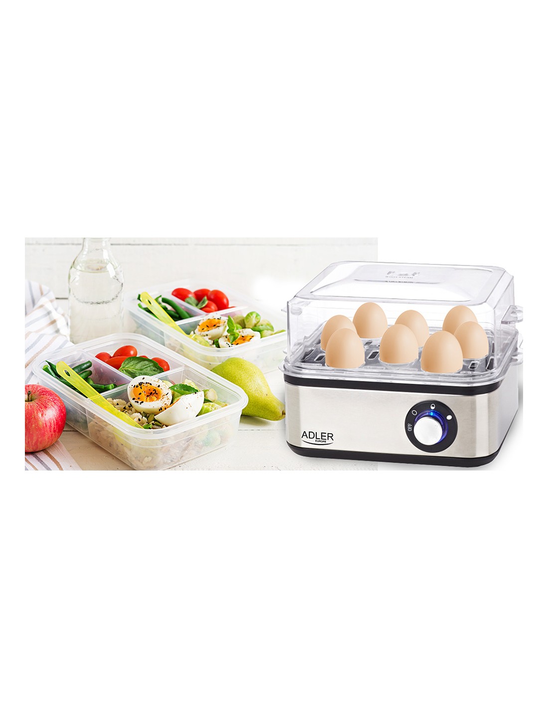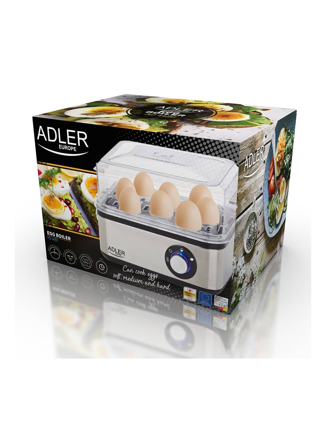 Cocedor de huevos ad 4486, 800 w de uno a ocho huevos a la vez, tres puntos de cocción, blandos, medios o duros luz indicadora, apagado automático con señal sonora, taza medidora de agua con aguja para perforar huevos, molde de huevo frito, potencia nominal 500 w, máxima 800 w carcasa metálica cable 82 cm 220-240 v~50-60 hz
