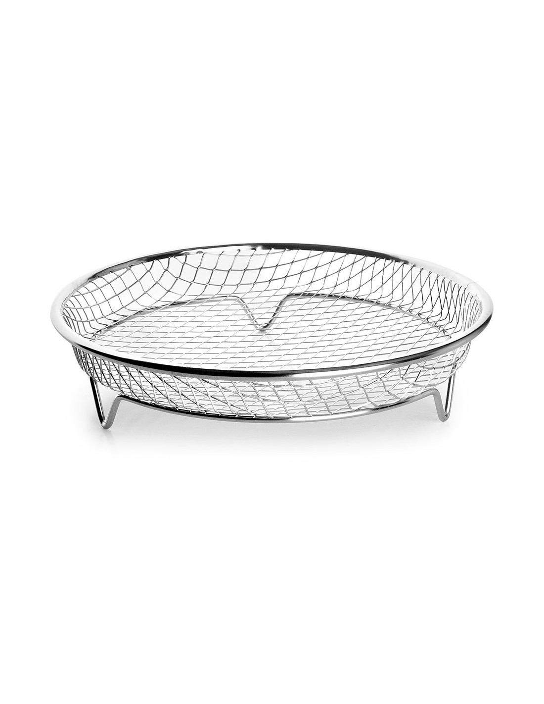 Cestillo redondo para freidora de aire, fabricado en acero inoxidable, permite una circulación de aire óptima para obtener alimentos crujientes, pudiéndose utilizar tanto dentro de moldes metálicos, papel o silicona, como directamente sobre la cubeta de la freidora. apto para lavavajillas ø19 x 4 cm.