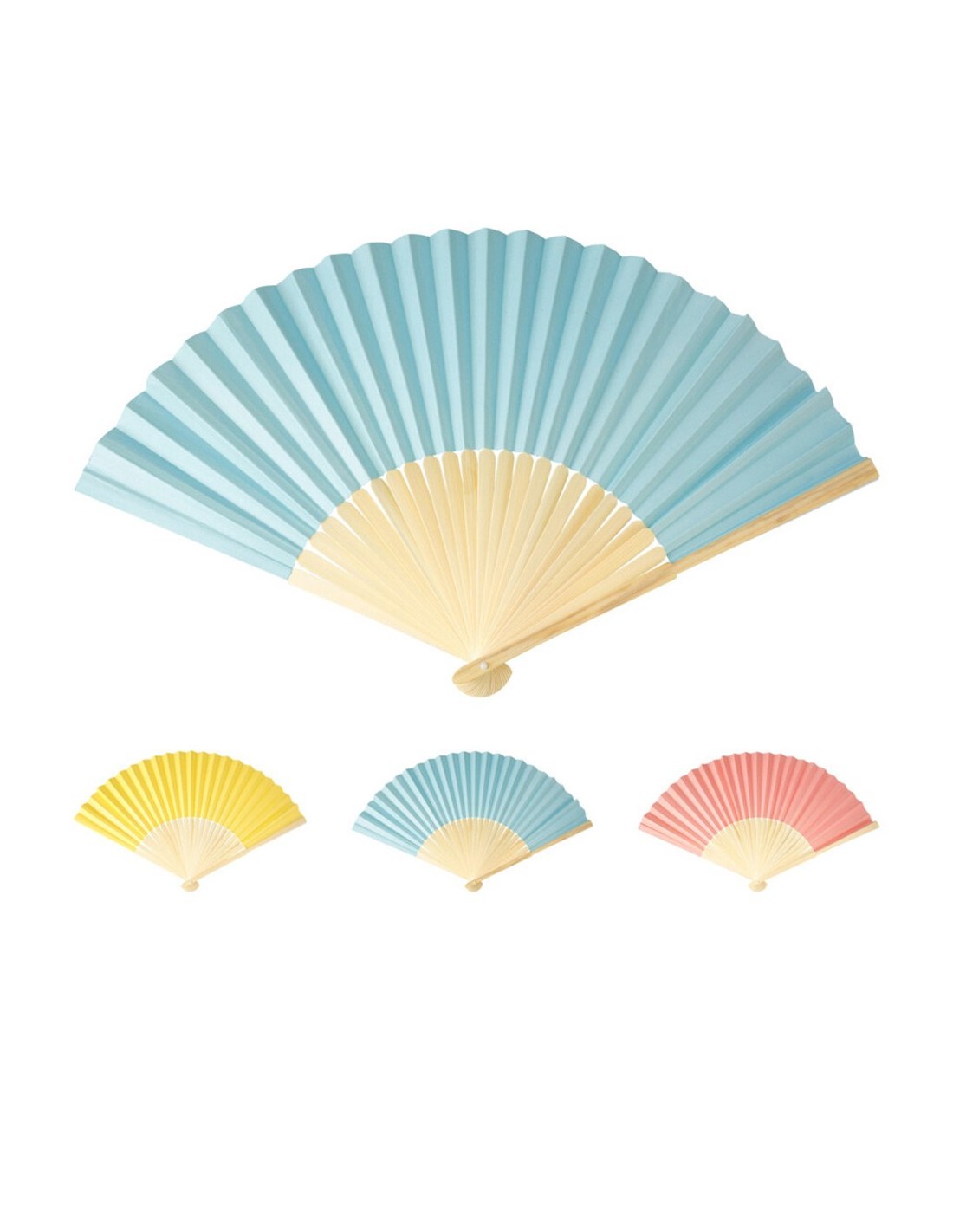 Abanico plegable de papel y bambú. medidas abierto: ø45 x 26,5 cm. doblado: 26,5 x 3,5 x 1,7 cm. colores surtidos. cada uno en funda de papel. presentado en expositor de 12 uds