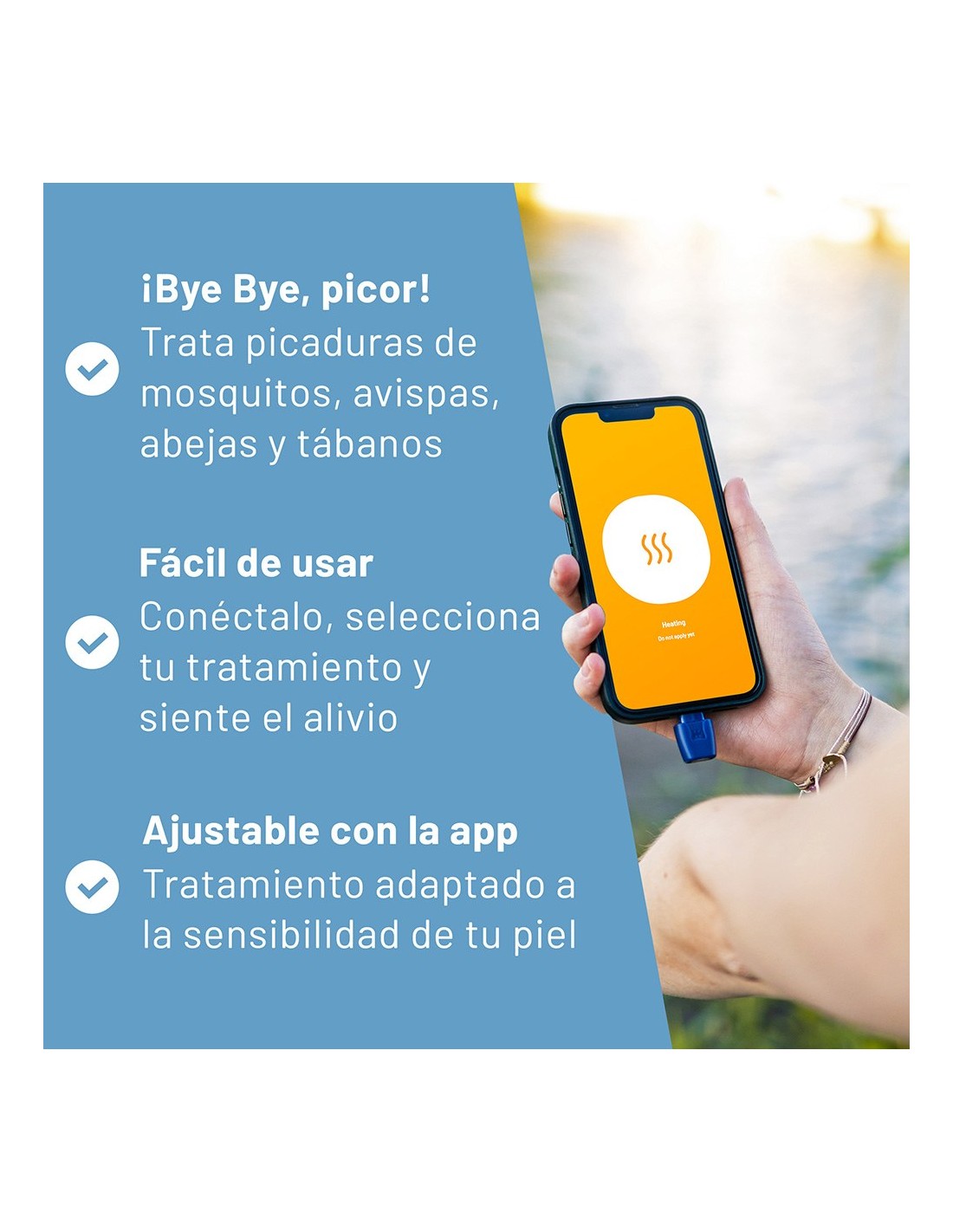 Dispositivo médico para el tratamiento de picaduras de insectos mediante la aplicación de calor sin químicos. funciona con calor a través de la app exclusiva de la marca y se aplica durante 4-9 segundos. se ajusta a la sensibilidad de la piel, apto para niños +3 años. formato llavero. con conexión usb-c. compatible con android y apple hasta iphone 15. presentado en expositor de 12 uds. dimensiones: 3.7 x 1.7 x 0.9 cm