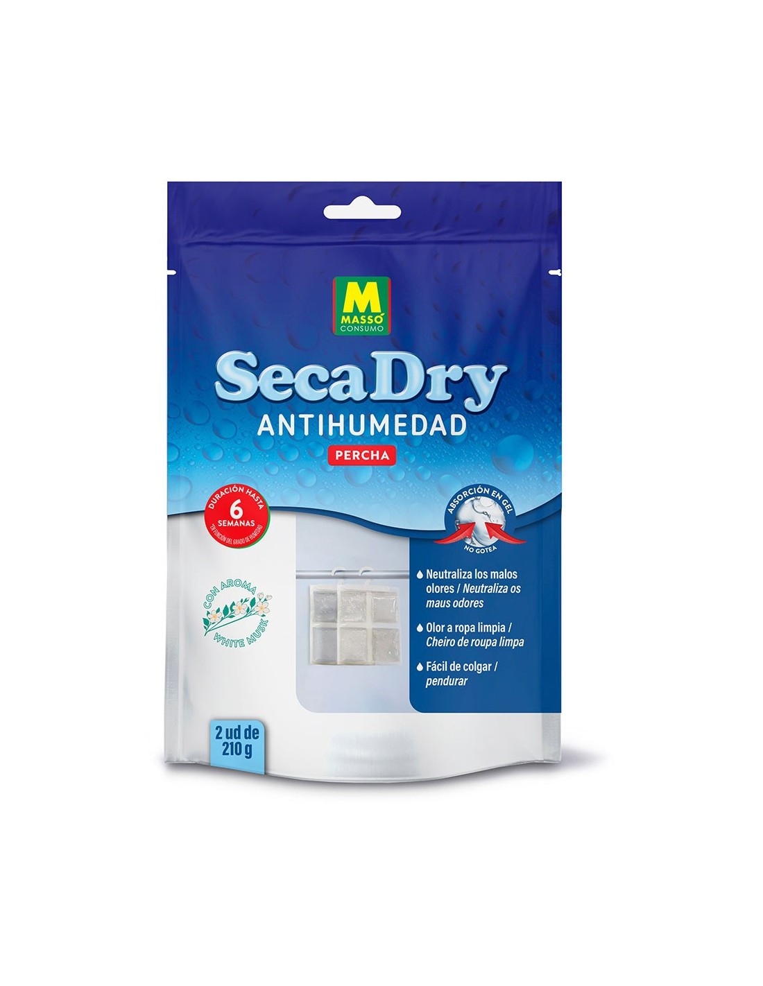 Percha antihumedad en gel secadry, 120 g, 2 uds. regula el exceso de humedad en el ambiente absorbiéndolo en forma de gel, evitando goteos. neutraliza los malos olores con su aroma white musk