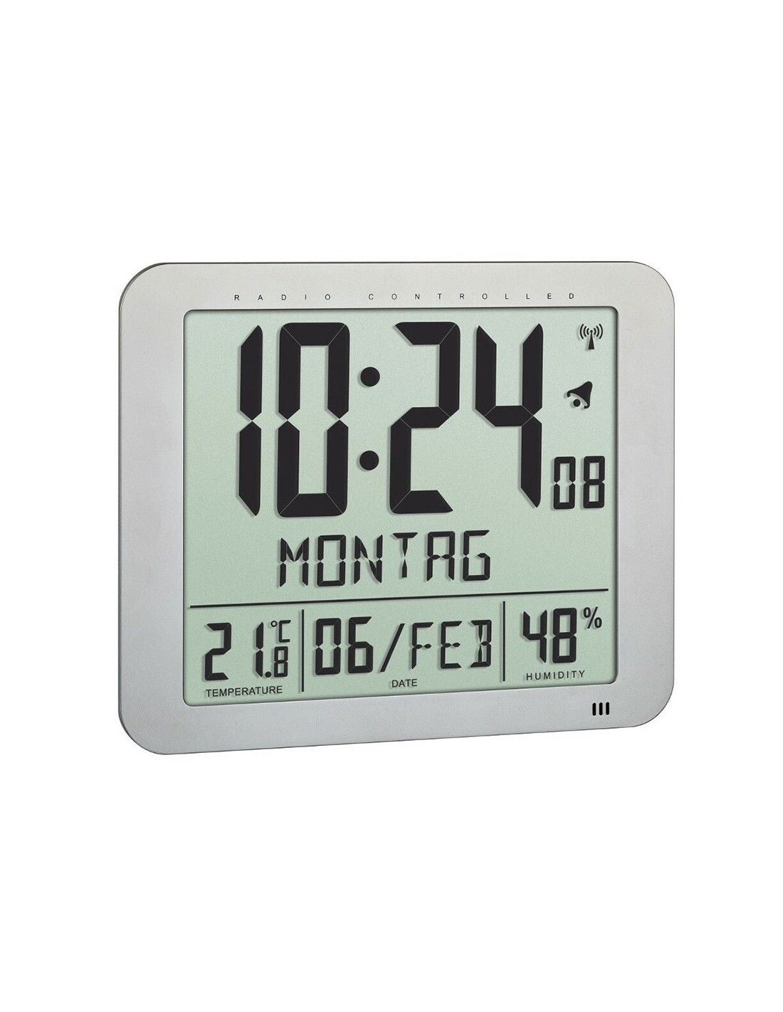 Reloj radio controlado de pared con pantalla lcd, visualización de temperatura y humedad interior. pantalla muy clara con día de la semana completo para facilitar la orientación temporal. alta precisión con zona horaria y posibilidad de ajuste manual. incluye configuración en 10 idiomas. alarma con función snooze y 2 modos de programación: laborables (lu-vi) o semana completa (lu-do). soporte para sobremesa o fijación mural. dimensiones: 25 x 3 x 21 cm. alimentación: 4 x aa (no incluidas)