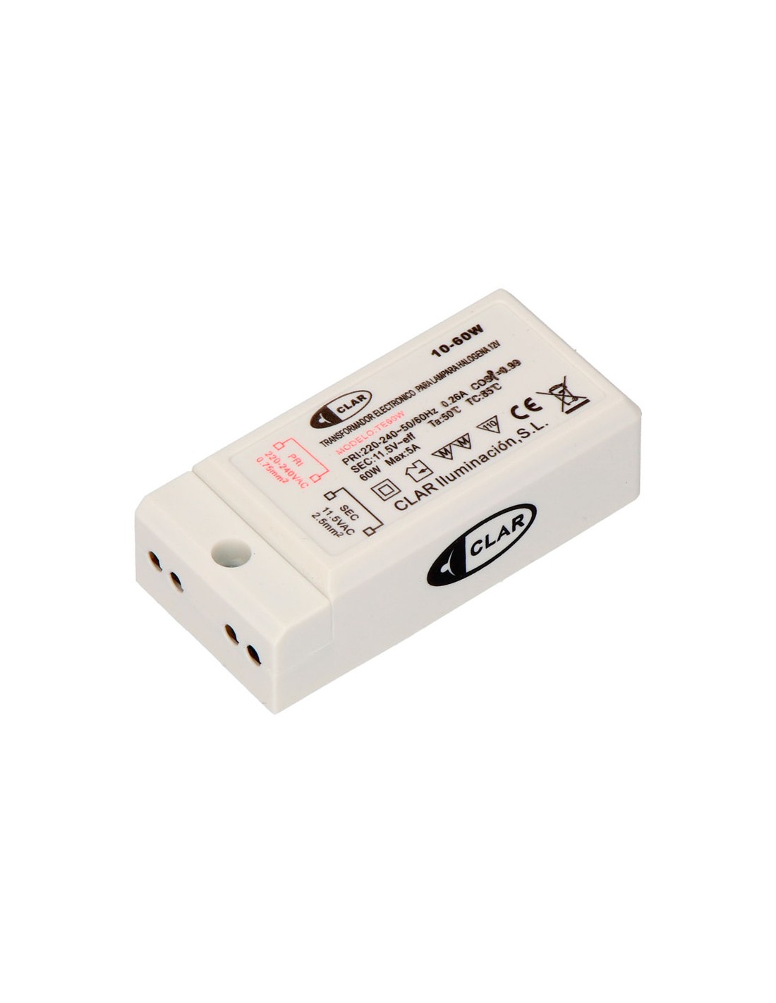 Transformador electronico para lampara halogena 12v 10/60w medidas: 67x33x20mm (ancho/fondo/alto). corriente alterna