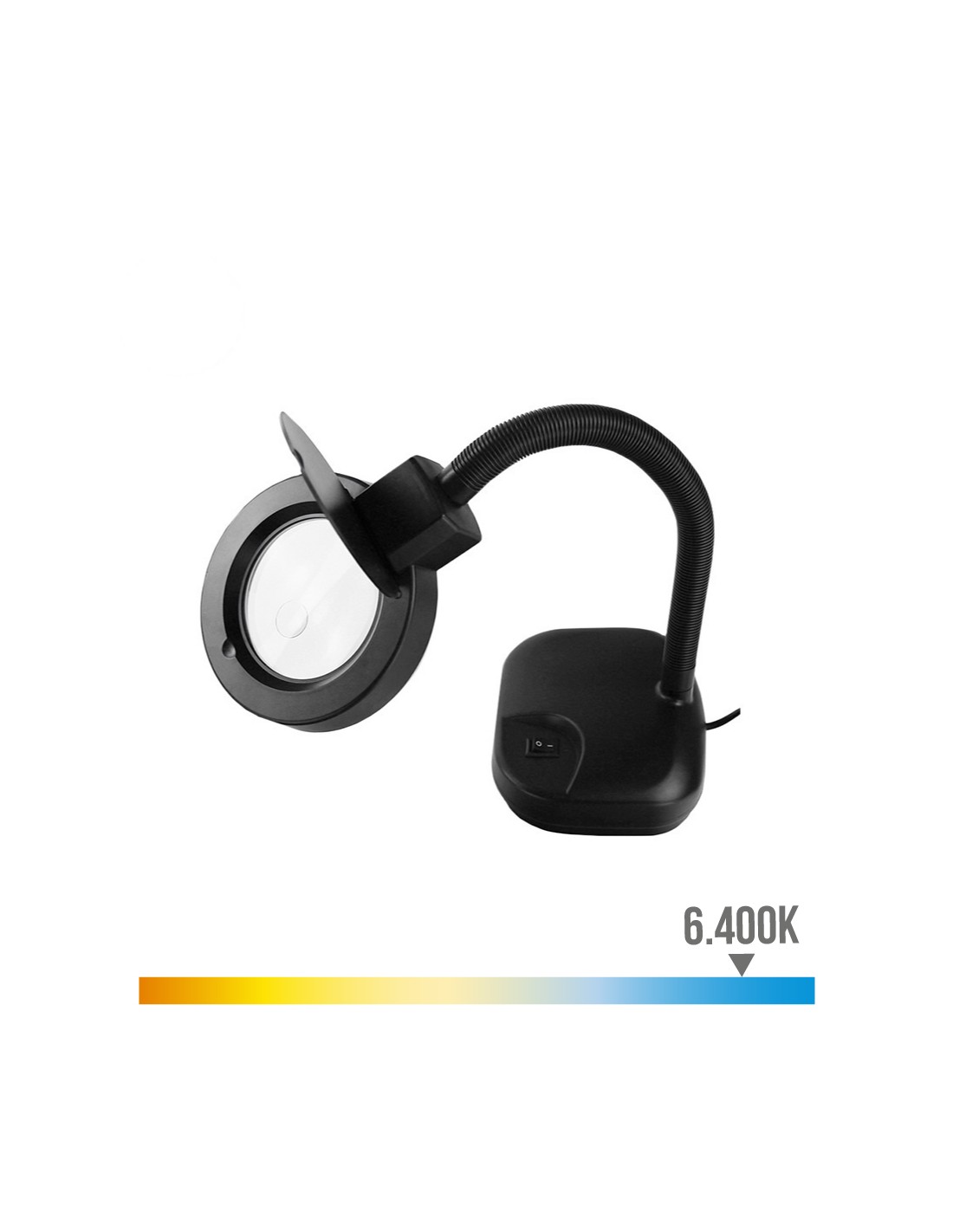 Flexo con lupa de sobremesa color negro. tubo circular 12w g10q t4 dioptrias 3-12 lente de 80mm. medidas: ø14x35cm (diámetro/alto) luz fria: 6400k. tension: 220-240v edm