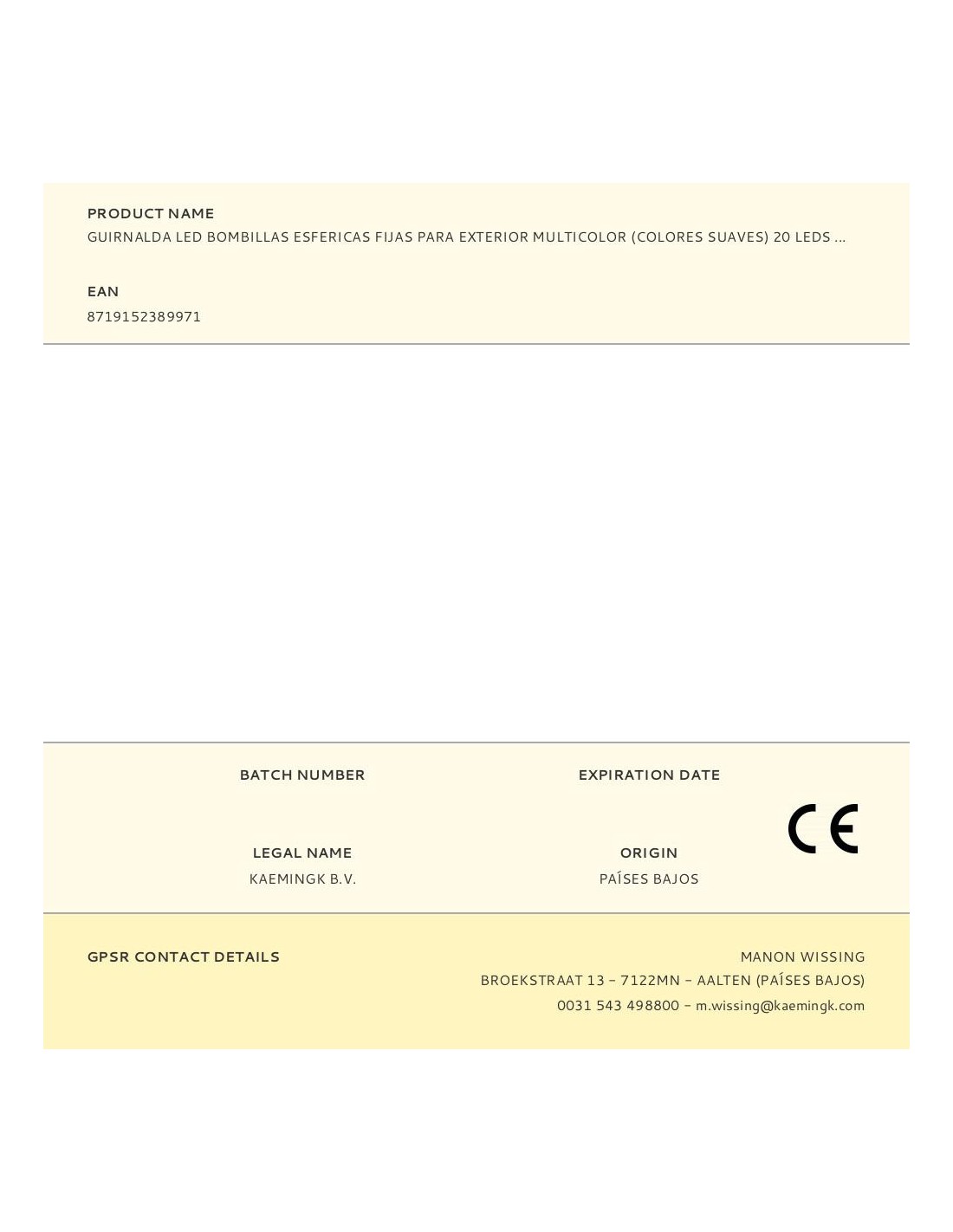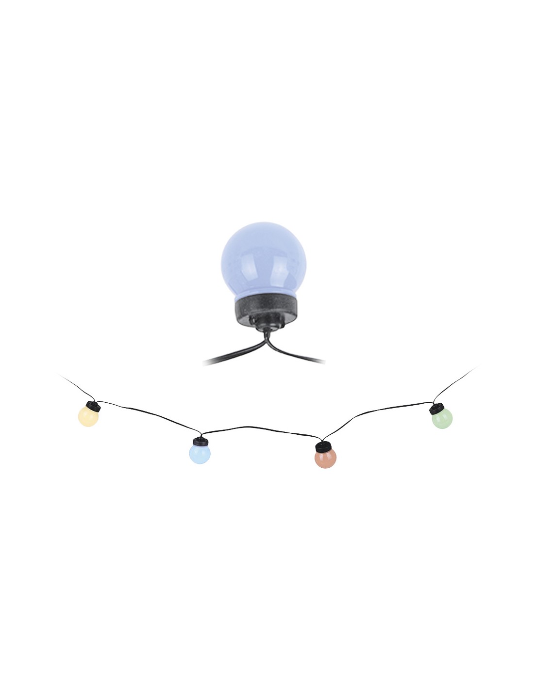 Guirnalda led bombillas esfericas fijas para exterior multicolor (colores suaves) 20 leds ip44 transformador. distancia entre bombillas 50cm distancia entre la primera bombilla y la ultima bombilla 9.5m. 4 leds por bombilla. 20 bombillas no reemplazables. cable alimentación 3m. largo total: 12,5m.