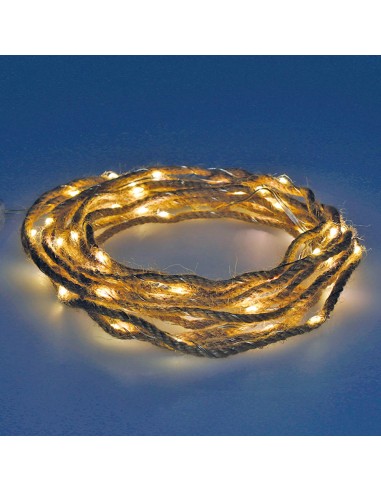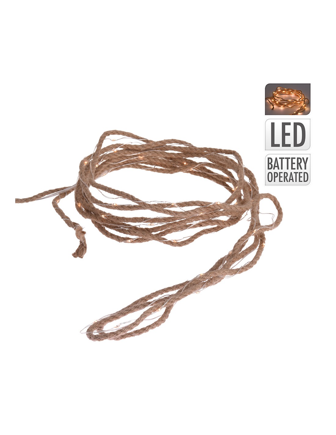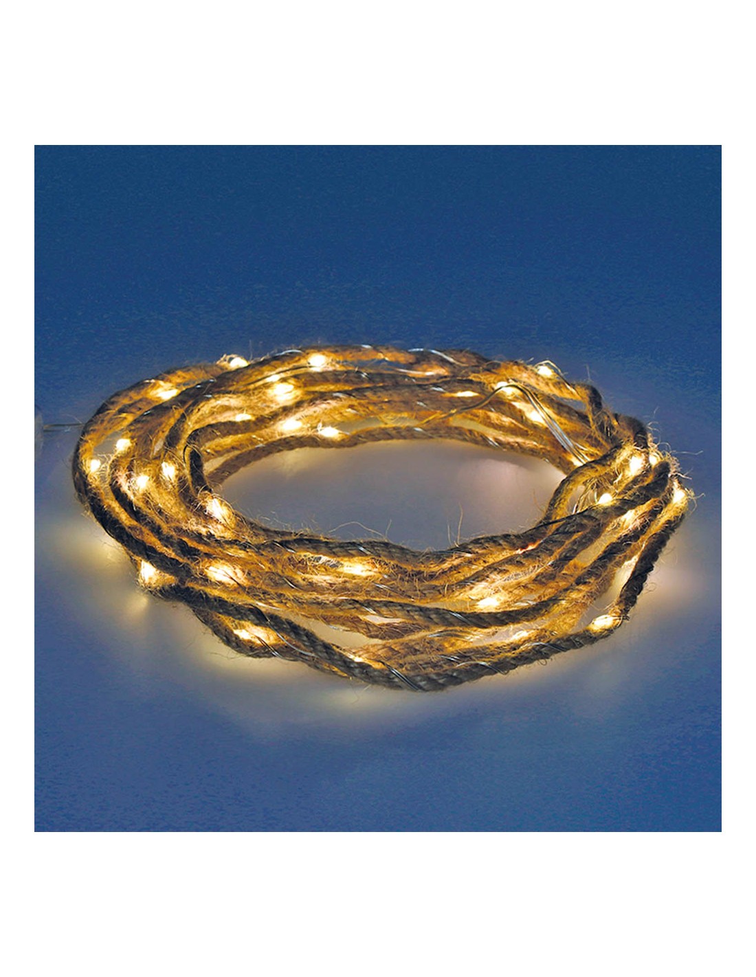 Guirnalda a pilas fija 50 microleds cuerda de yute luz blanco calido pilas 3xaa no incluidas ip20 cable marron 16,7cm entre bombillas leds ø5mm cable alimentacion 30cm. distancia entre la primera bombilla y la ultima 5m. largo total: 5,03m