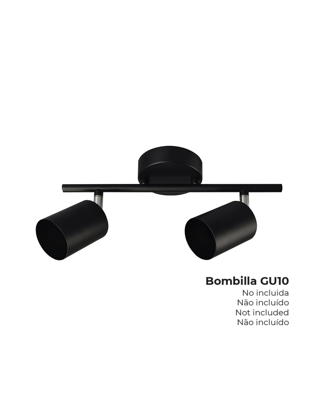 Foco 2 elementos color negro gu10 potencia máxima: 50 w (bombillas no incluidas) 50 hz medidas: 30 x 9 x 17 cm tensión: 220 - 240 v