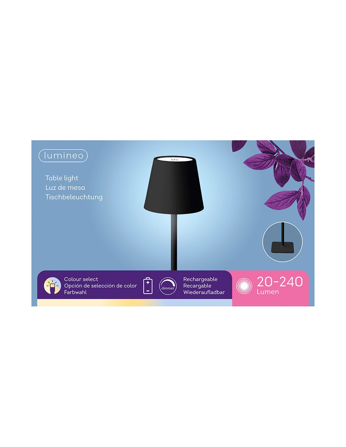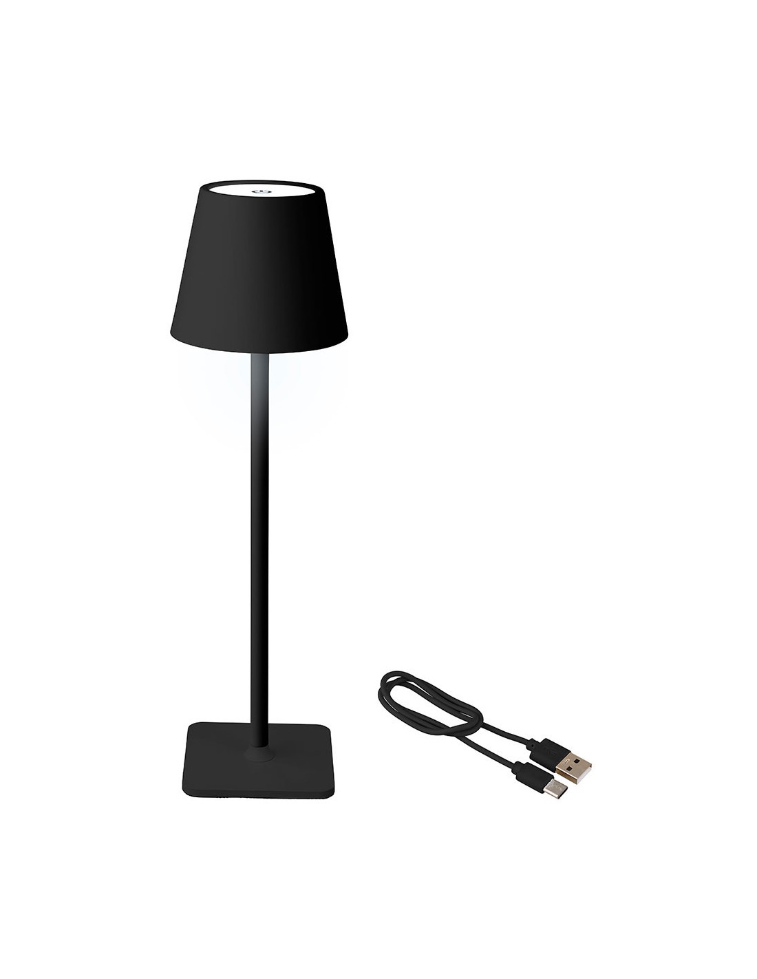 Lámpara led regarcable de mesa color negro para exterior y interior 27cm. batería 3600 mah lithium con cargador tipo c. material: metal. 20-240 lumen. opción de color cálido y frío. medidas: ø 9 x 27 cm. cable de 1 m