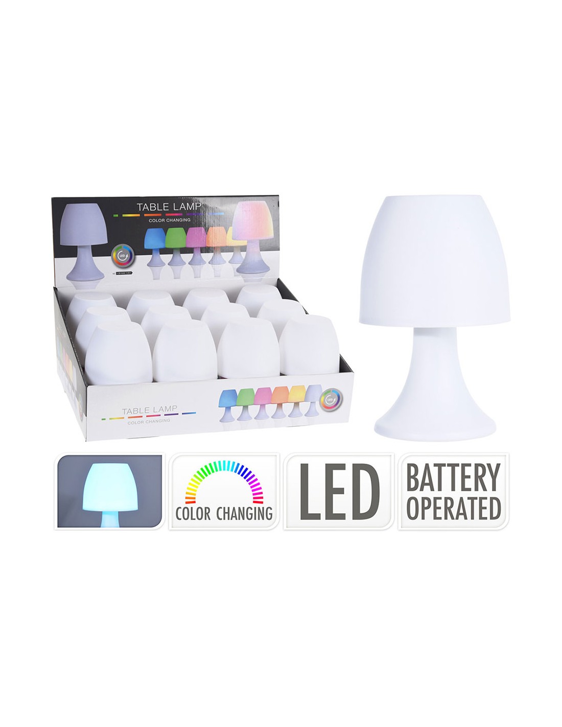 Lampara de mesa led, led multicolor, a pilas, medidas ø12x19cm, funciona con tres pilas aaa (no incluidas), número de leds 3, con tres posiciones ( multicolor, blanco, apagado). basics