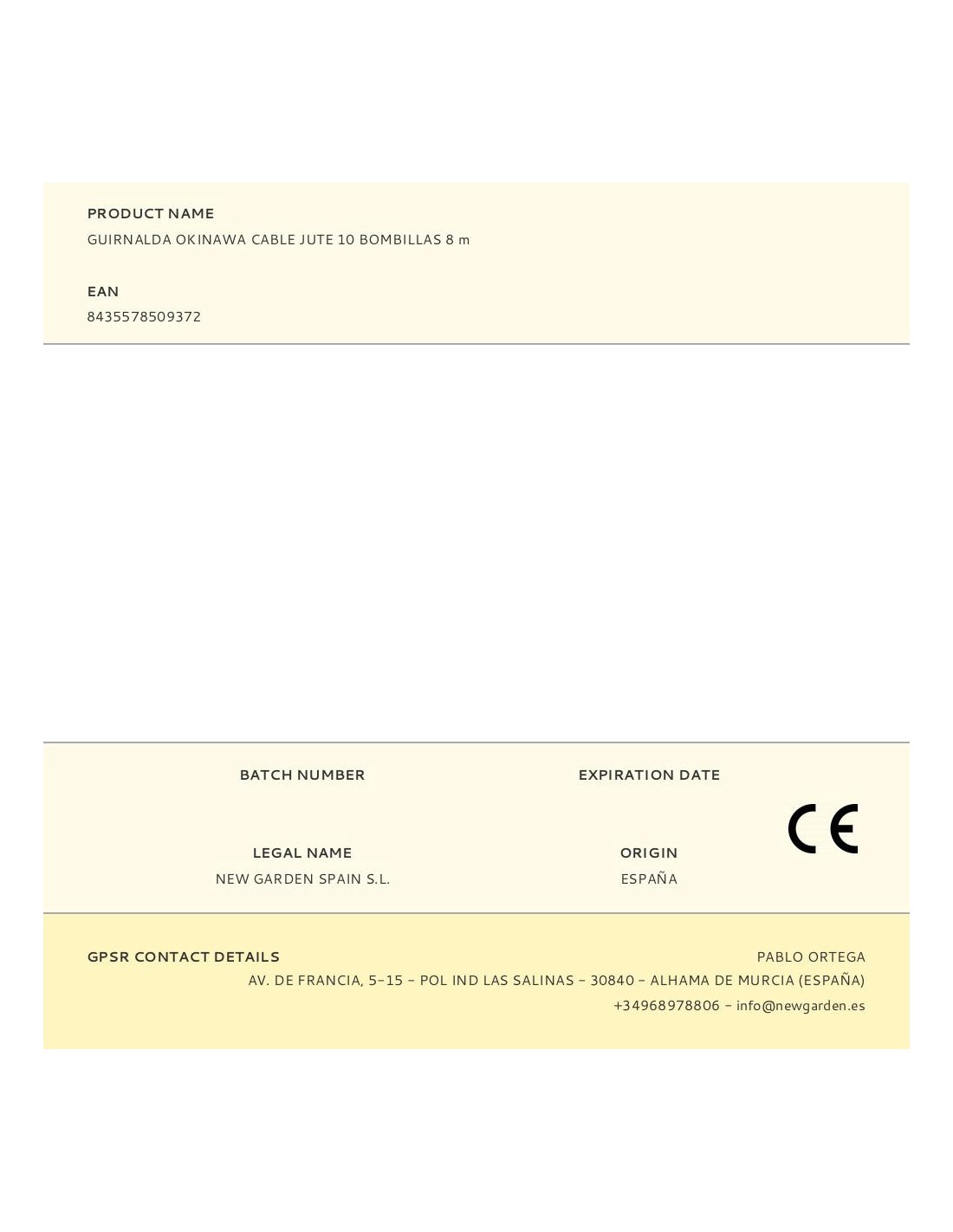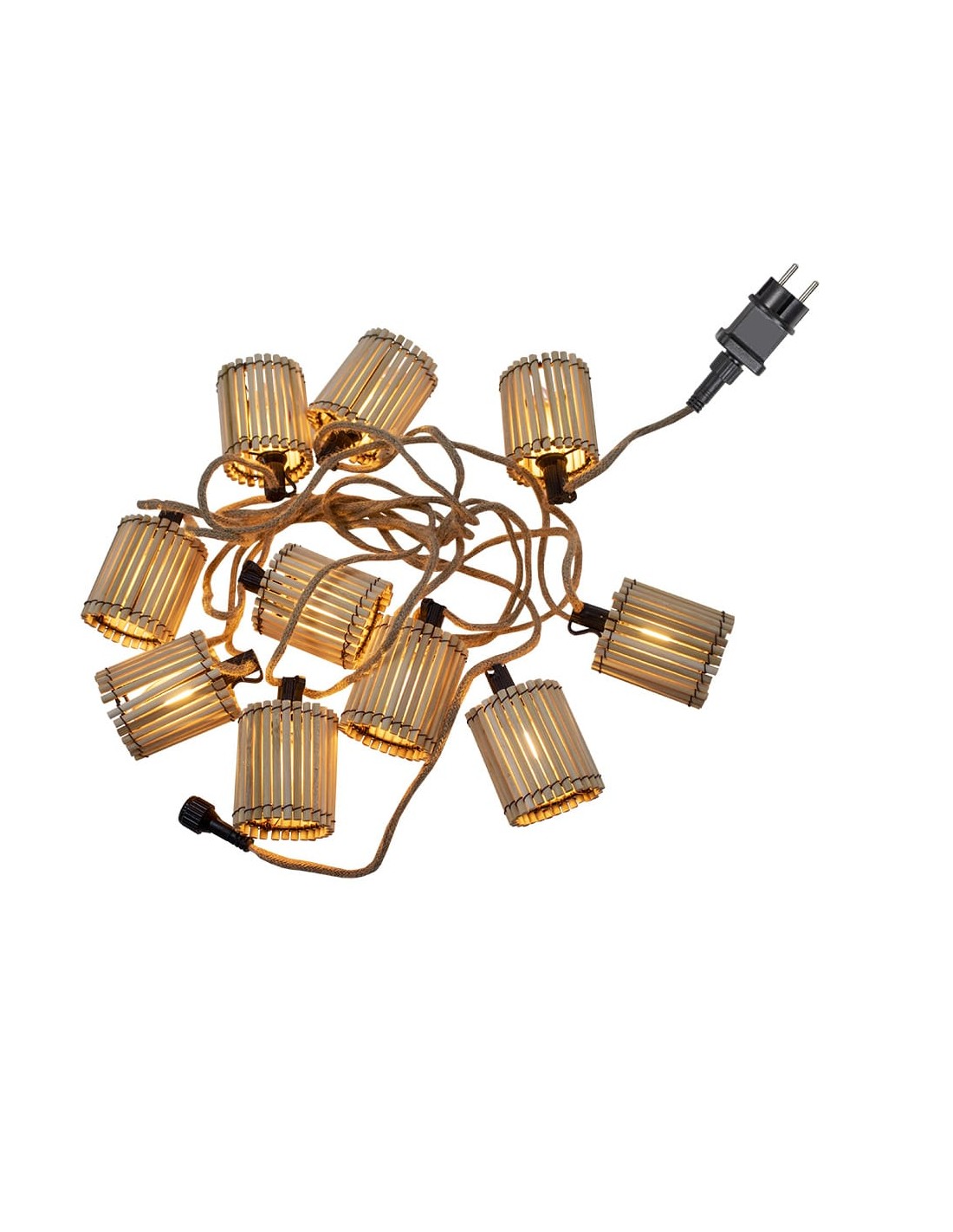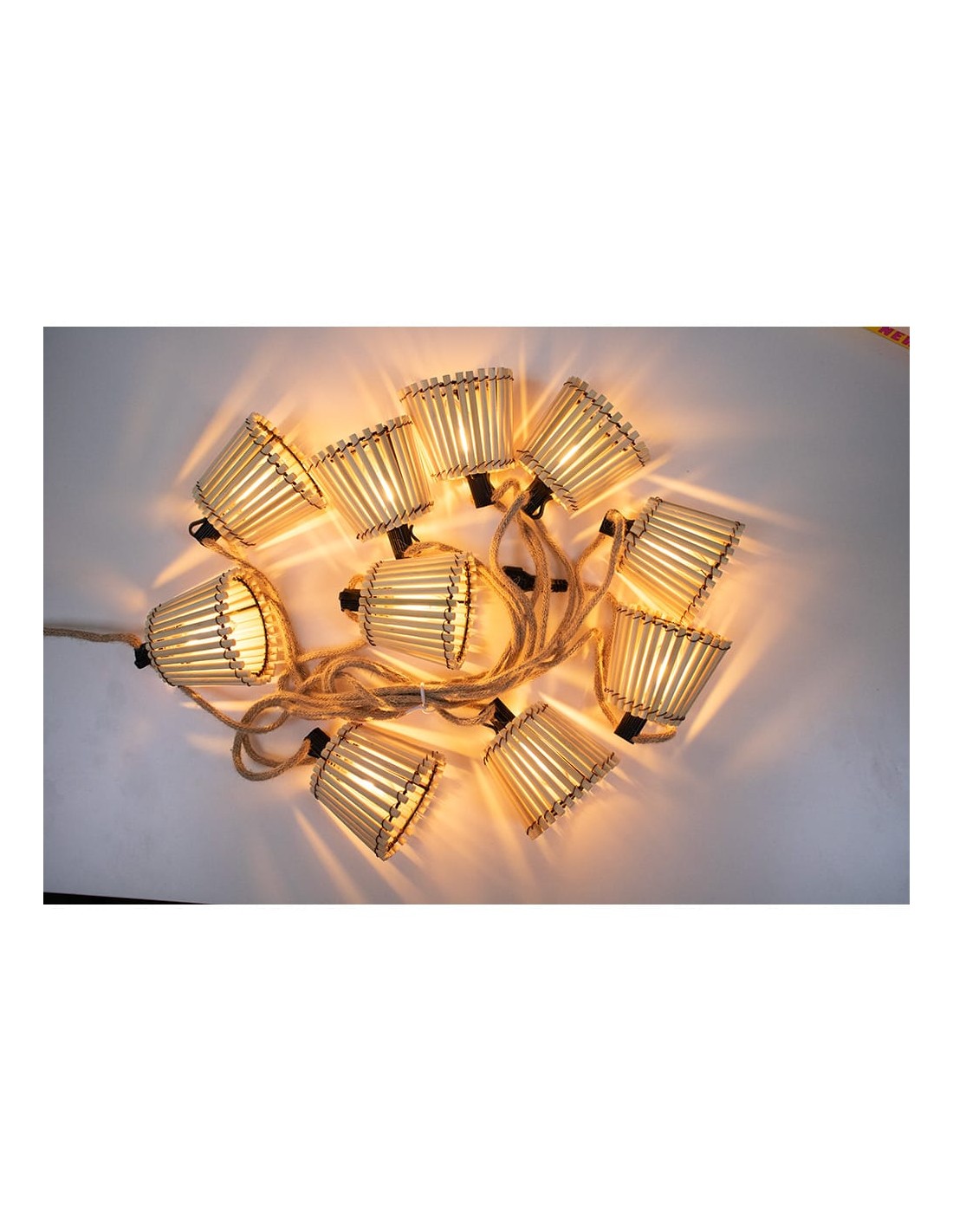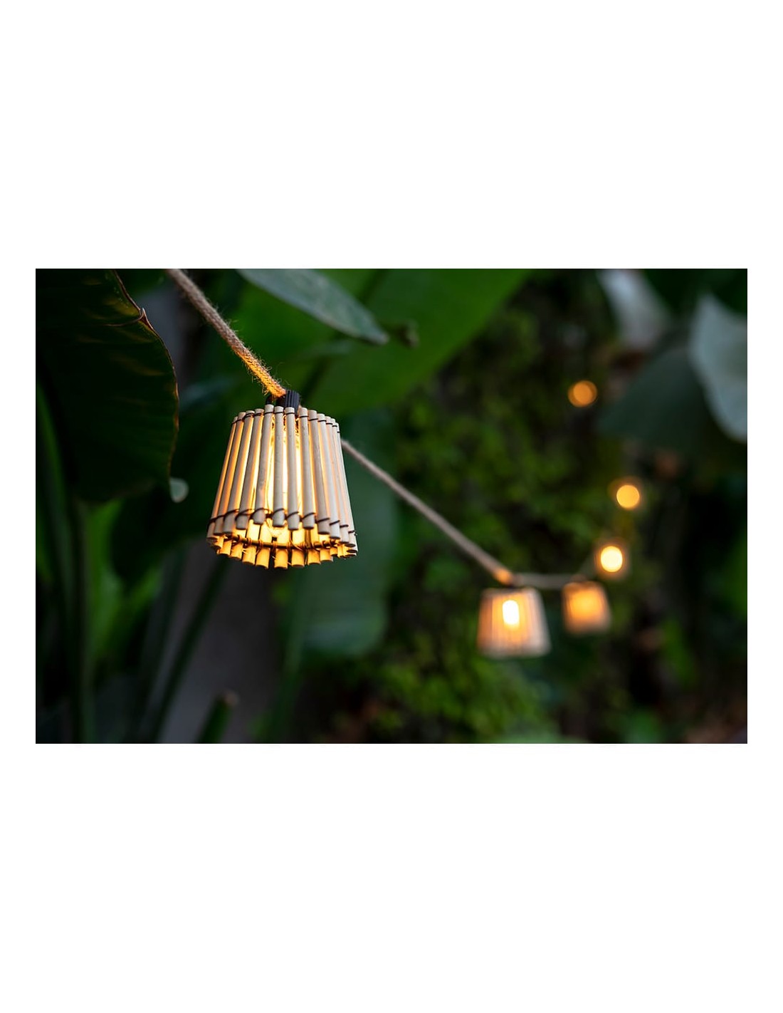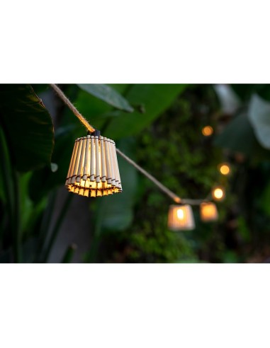 Okinawa es una guirnalda de cable con 10 bombillas de led integrado recambiables y 10 tulipas hechas de bambu. es ip44 y mide 8 m de largo. pueden conectarse hasta 4 guirnaldas entre si. 35lm/bombilla, e27, 2,200k, 85-265 v ac, 50/60hz, 8,4w, vida 20.000h, eficiencia c, angulo iluminación 200° cri70 28,5x15x12cm longitud cable alimentación 3,25m, distancia entre bombillas 50cm.