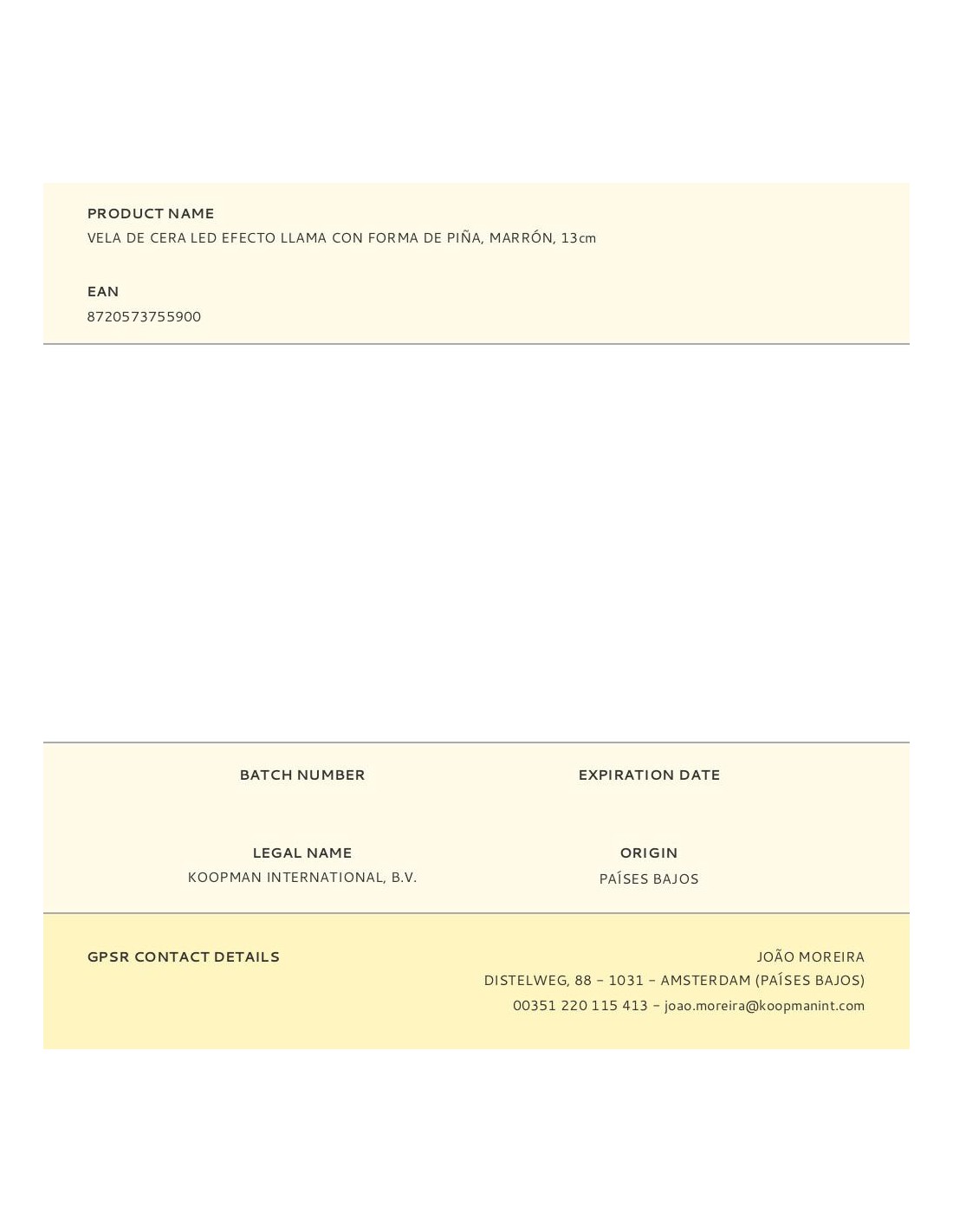 Vela led efecto llama con forma de piña, color marrón, medida: 13 cm. funciona con pilas 2 x aa (no incluidas), para uso interior con temporizador de 6 h y 18 h de apagado