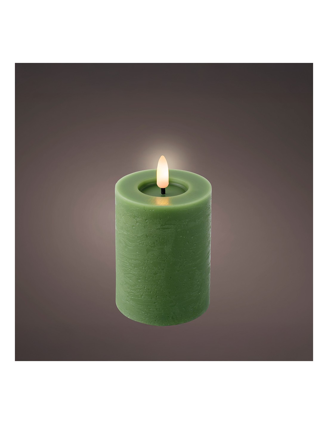 Vela de cera led, efecto llama, color verde, superficie lisa, acabado rústico, medidas: ø7 x 11,2 cm. uso: interior. color led: luz cálida con temporizador 6 h encendida/18 h apagada autonomía: 250 h funciona con pilas 2 x aaa (no incluidas)