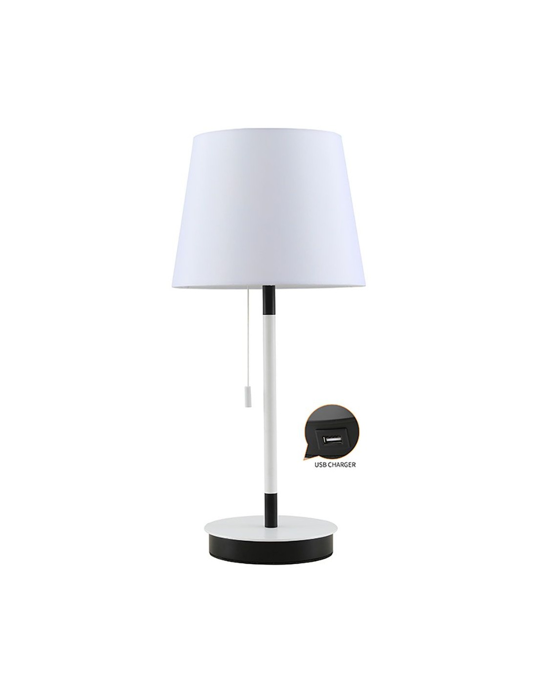 Lámpara de mesa e27, color blanca y negra, con cargador usb metálica pantalla tela blanca, base metálica, interruptor de cadena recomendada bombilla led máximo 40 w, bombilla no incluida, ip20 220 - 240 v ~50/60 hz ø235 x 505 mm