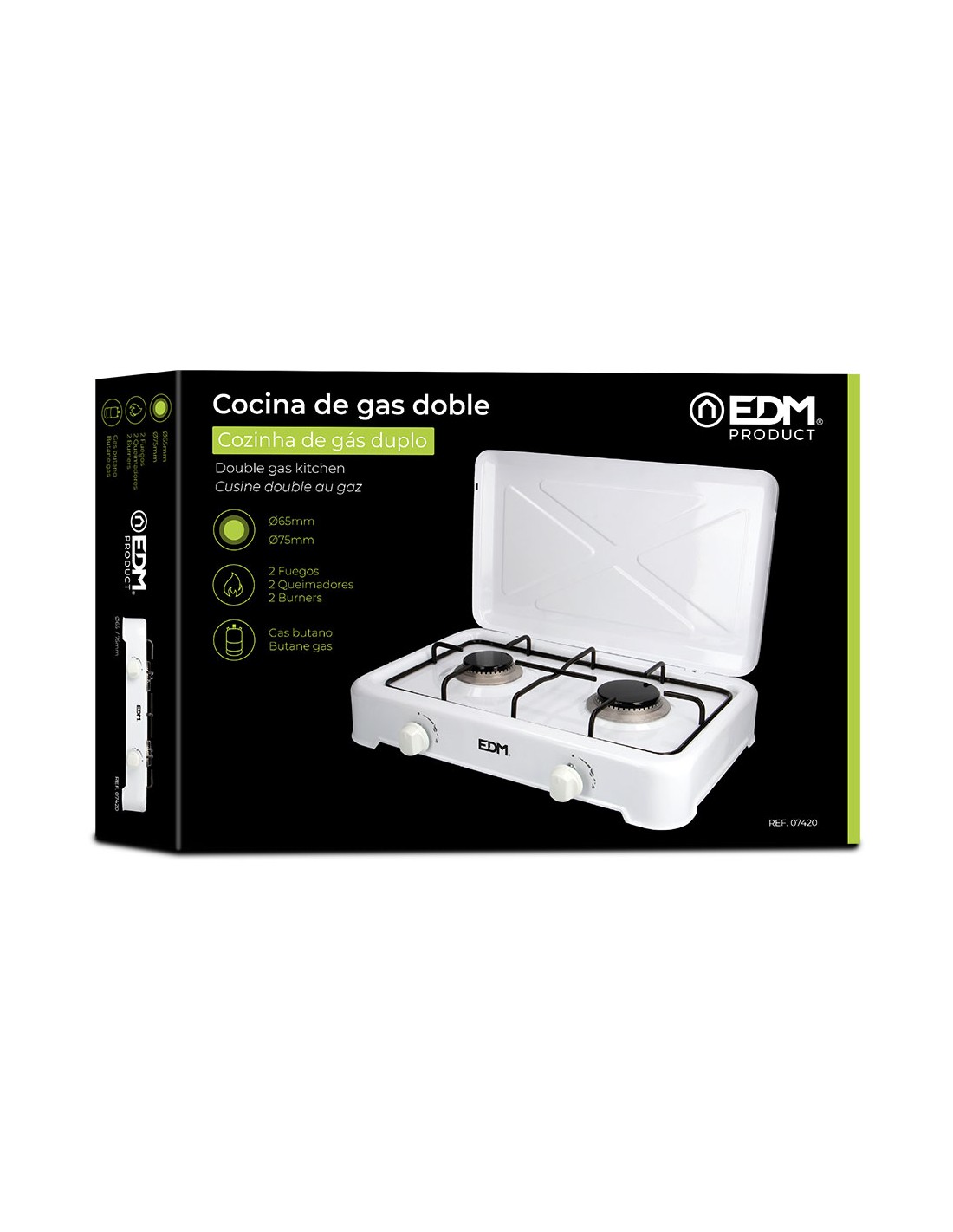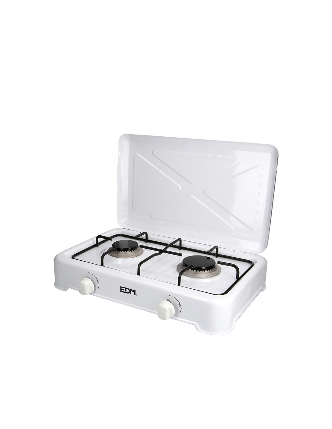 Cocina de gas esmaltada 2 fuegos. 1 fuego ø65mm + 1 fuego ø75mm. color blanco. para utilizar solo con gas butano y solo en exteriores. dimensiones: 48x33x8cm.edm