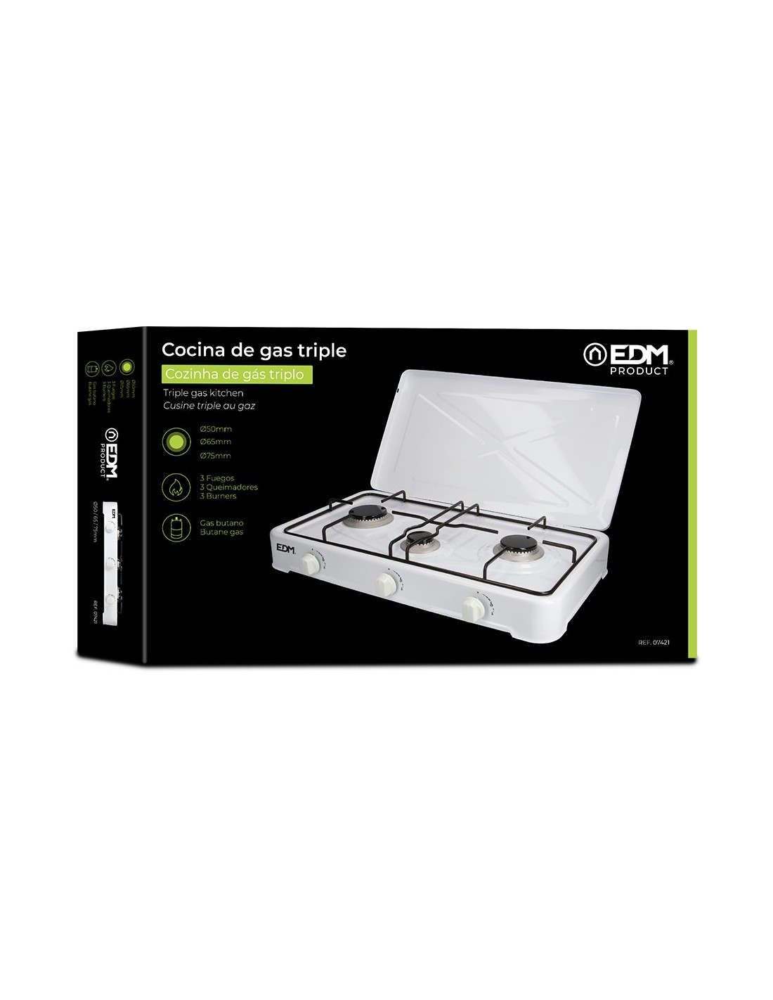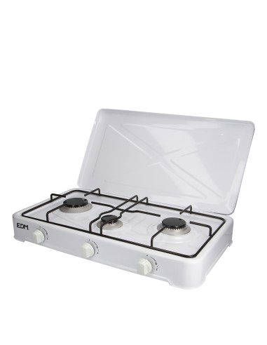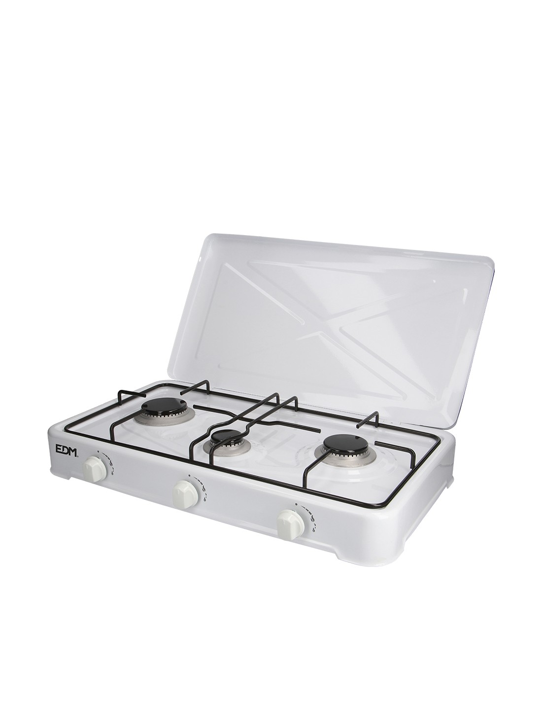 Cocina de gas esmaltada 3 fuegos. 1 fuego ø50mm + 1 fuego ø65mm + 1 fuego ø75mm. color blanco. para utilizar solo con gas butano y solo en exteriores. dimensiones: 60 x 37 x 10 cm (ancho/fondo/alto) edm
