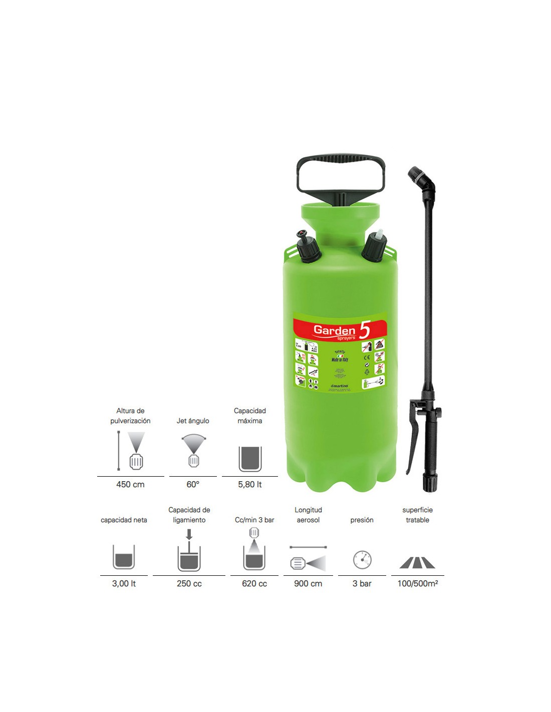 Pulverizador / vaporizador 5 l. valvula de seguridad con indicador de presion, filtro incluido, chorros diversos, varilla de resina reforzada, tubo resistente al calor y al hielo, resortes de acero inox, regulador de presion, dimensiones: 19x19x47cm (ancho/fondo/alto), altura pulverizacion 450cm, jet angulo 60°, 3 bar