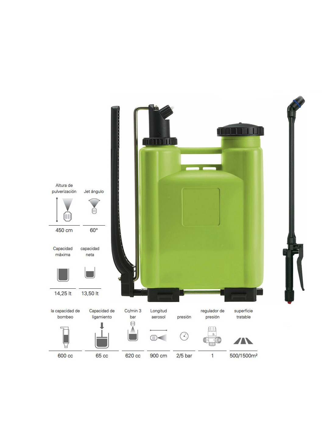 Pulverizador / vaporizador mochila 15 l, peso 2,9kg, altura pulverizacion 450cm, jet angulo 60°, 2/5 bar, apto para una superficie entre 500/1500m, capacidad maxima 14,25 l, capacidad neta 13,5 l, capacidad de la bomba 600cc