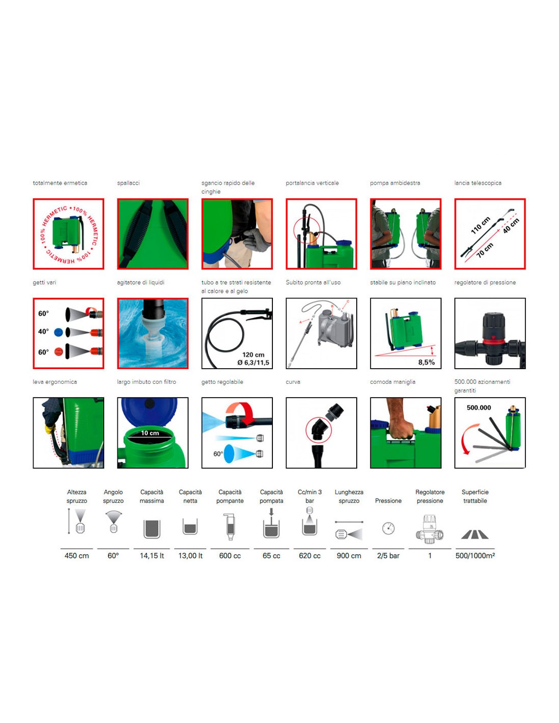 Pulverizador / vaporizador mochila 13 l rosy. altura pulverizador 450cm, jet angulo 60°, capacidad maxima 14-15 l, capacidad neta 13 l, capacidad bomba 600cc, presion 2/5 bar. ideal para una superficie de trabajo 500/1000m