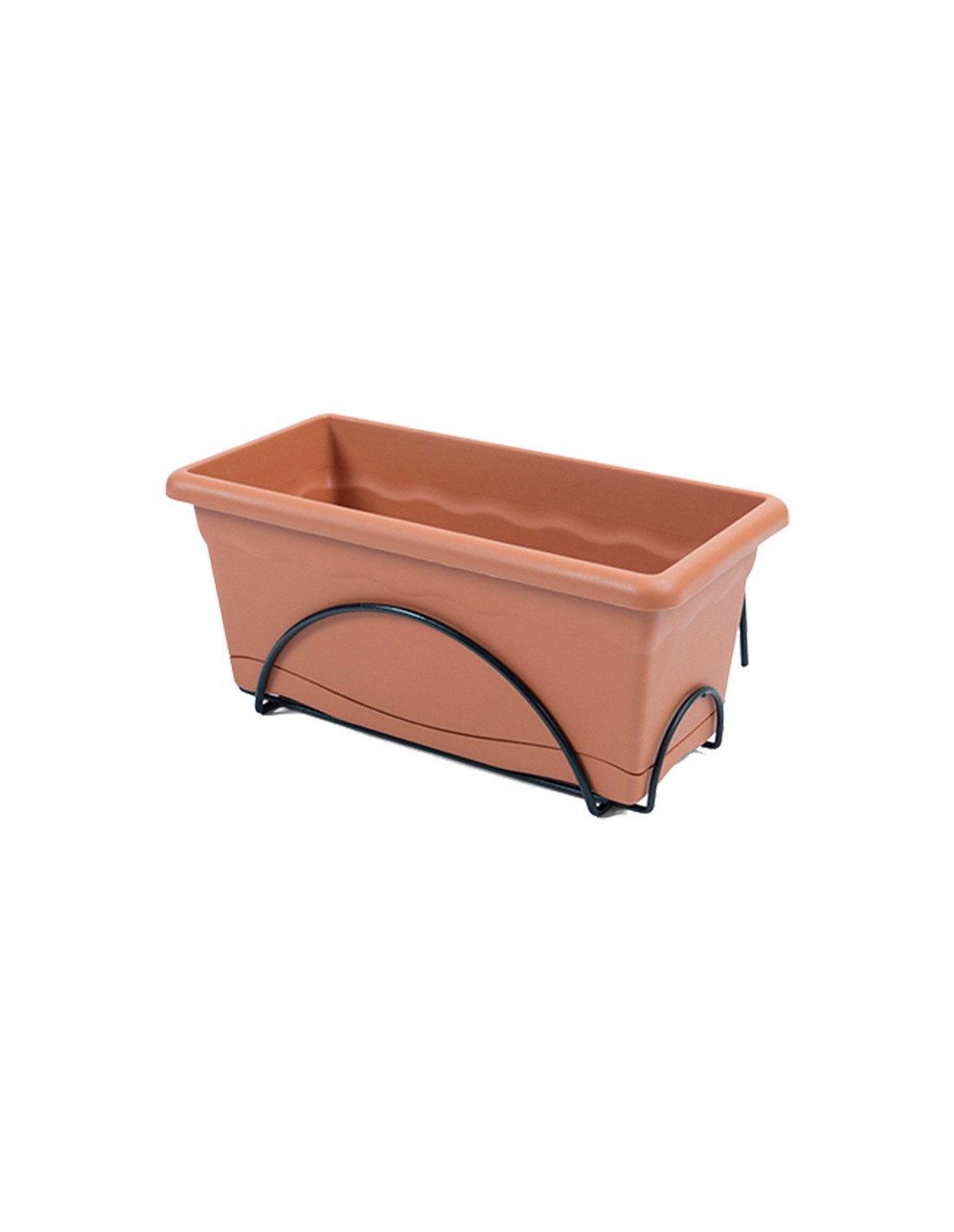 Jardinera con plato integrado 40x24cm (ancho/fondo) + soporte metalico. color terracota. pensada para uso en exteriores por su alta resistencia a los rayos solares, su robustez y su textura