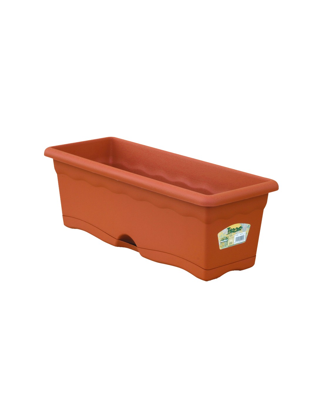 Jardinera con plato integrado color terracota 80x20cm. (ancho/fondo) pensada para uso en exteriores por su alta resistencia a los rayos solares, su robustez y su textura