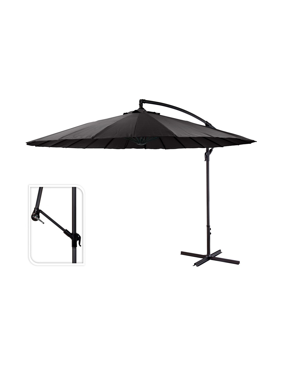 Parasol excéntrico color antracita con manivela, 180 gr / m, no incluye base. cuerpo de acero con recubrimiento de poliamida y tela de poliéster. dimensiones: altura máxima 3 m / ø 300 cm. tubo principal de acero 48 x 1,2 mm / tubo transversal 42 x 1,0 mm, 24 varillas de fibra de vidrio de 7 mm (recubiertas de polietileno negro)