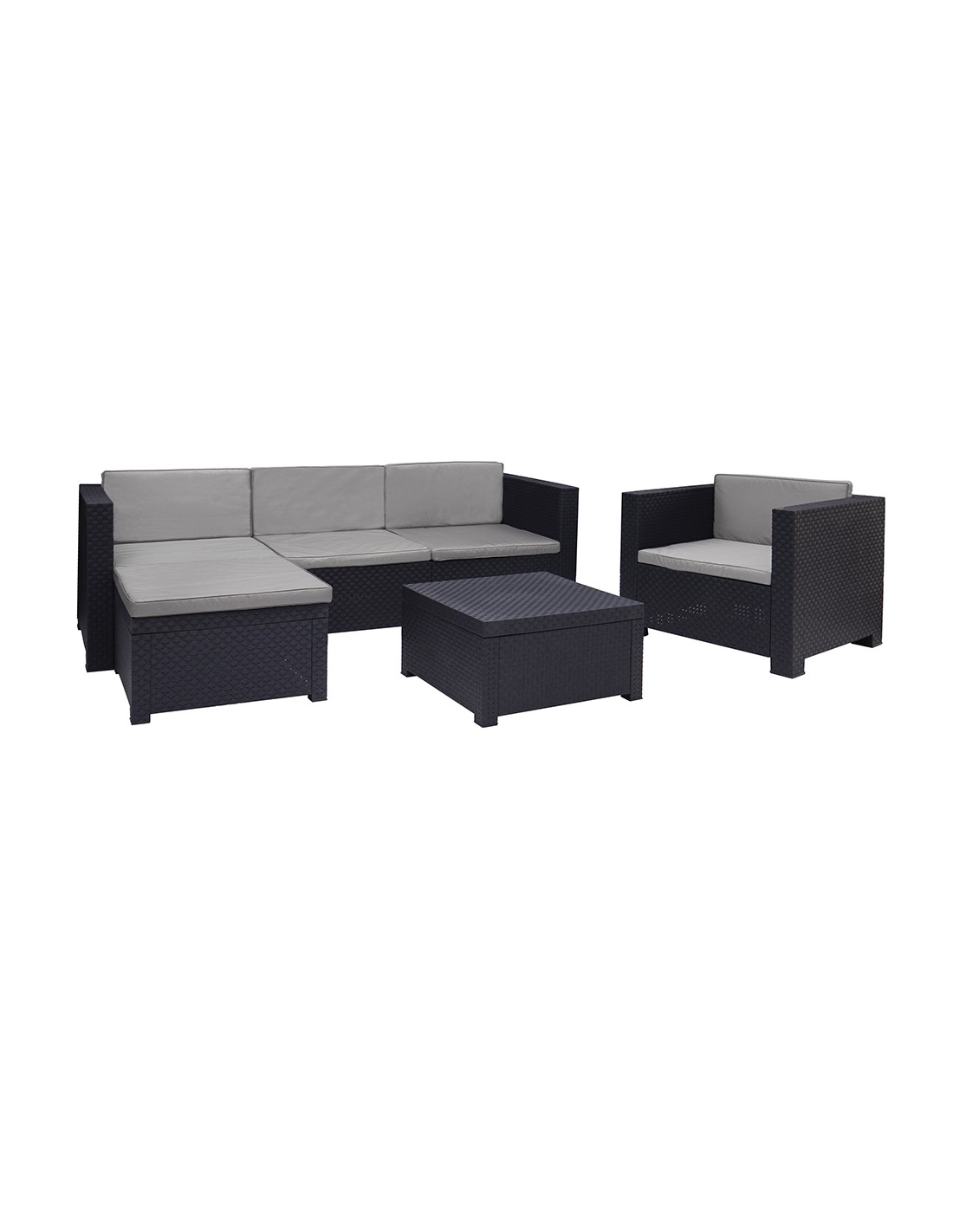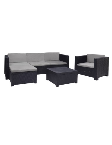 Set manhattan grafito sp berner. set chaise longue con textura de ratan plano formado por un banco de tres plazas, sillon individual, pouf y mesa. fabricado en españa con materiales reciclados. medidas sillón 72x66x74cm (alto/profundo/largo) sofá: 72x66x190cm (alto/profundo/largo) mesa: 34x57x57cm (alto/profundo/largo) pouf: 39x56x56cm (alto/profundo/largo) resistente uv, restitente a la lluvia, facil de limpiar. fabricado totalmente en resina. cojines de color gris incluidos.