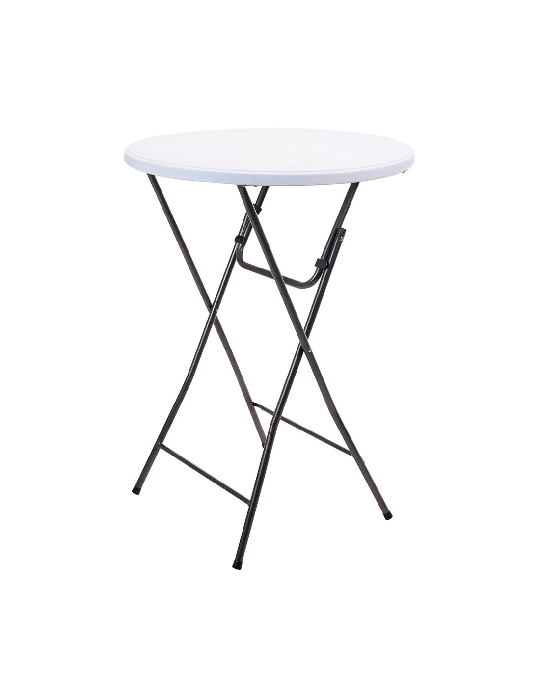 Mesa redonda de jardín. plegable, de polietileno. color: blanca. ø80x110cm (diámetro/alto) peso: 6,9kg fabricacion: polietileno/acero. dimensiones plegada: 80x4,5x138cm progarden