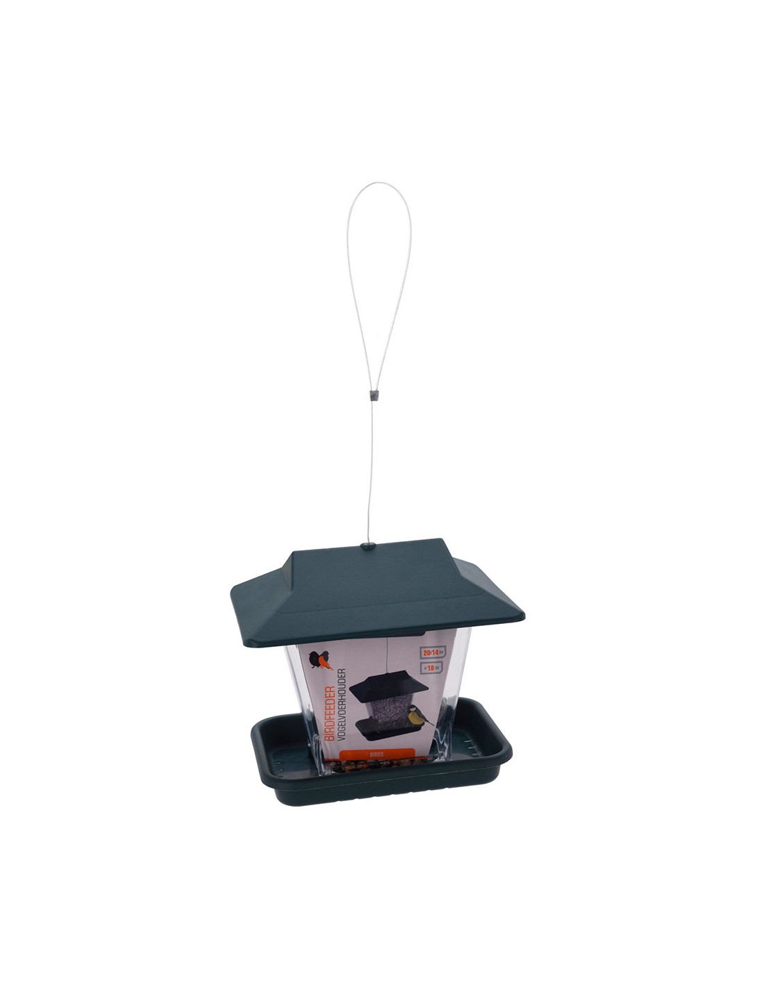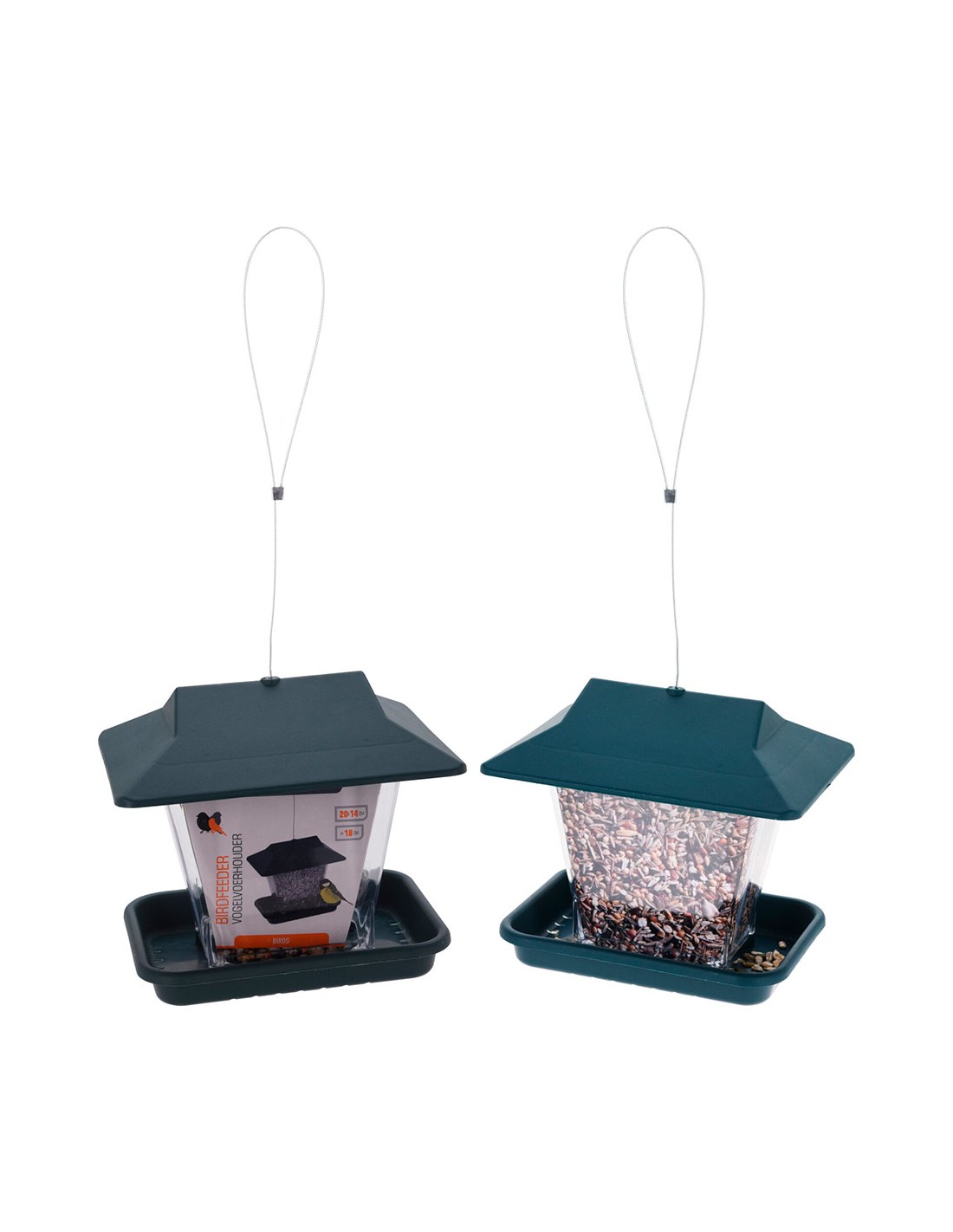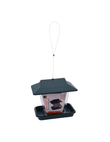 Comedero para pajaros. color verde. en forma de casita 20x14x18cm (ancho/fondo/alto) con colgador metálico. material: plastico polipropileno. para exterior.
