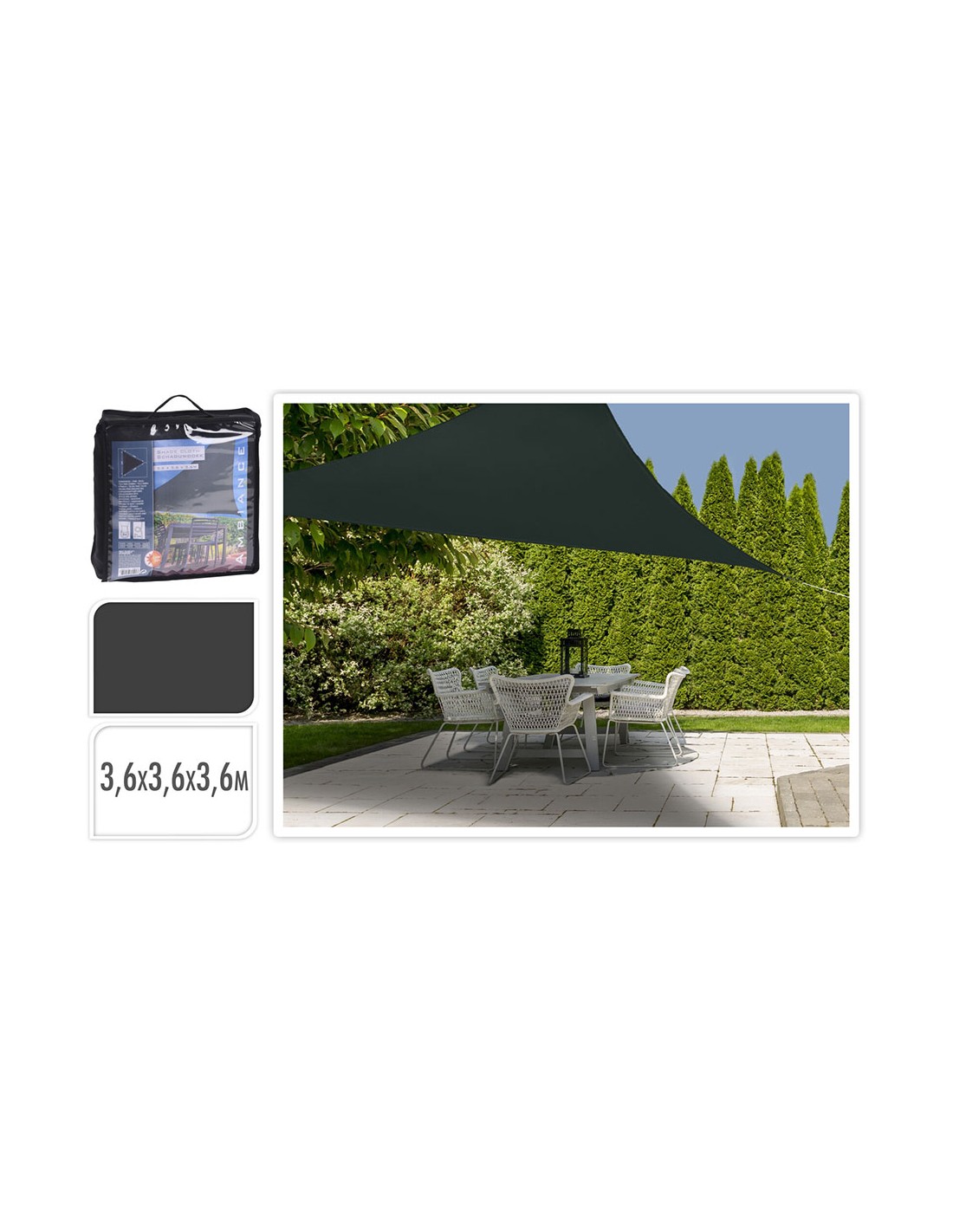 Toldo de tela triangular color: gris oscuro 360x360x360cm (ancho/fondo) fabricado con poliester peso: 0,96kg ambiance