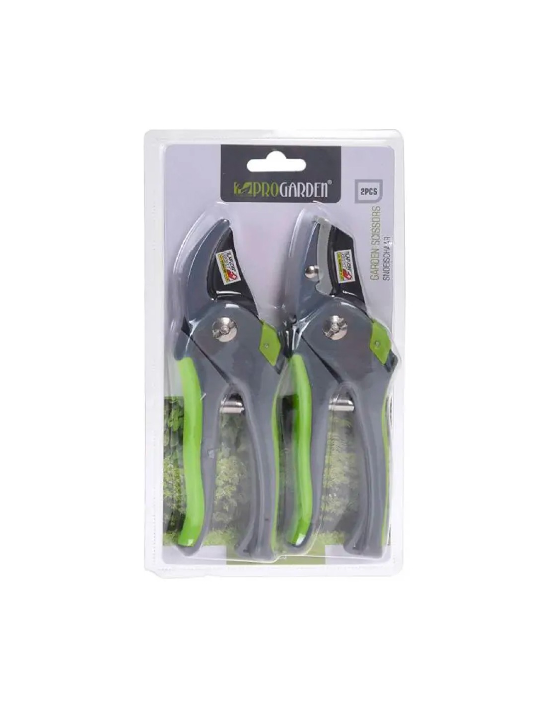 Pack 2 tijeras de poda con mango de plastico verde. empuñaduras de espuma. peso: 0,22kg progarden