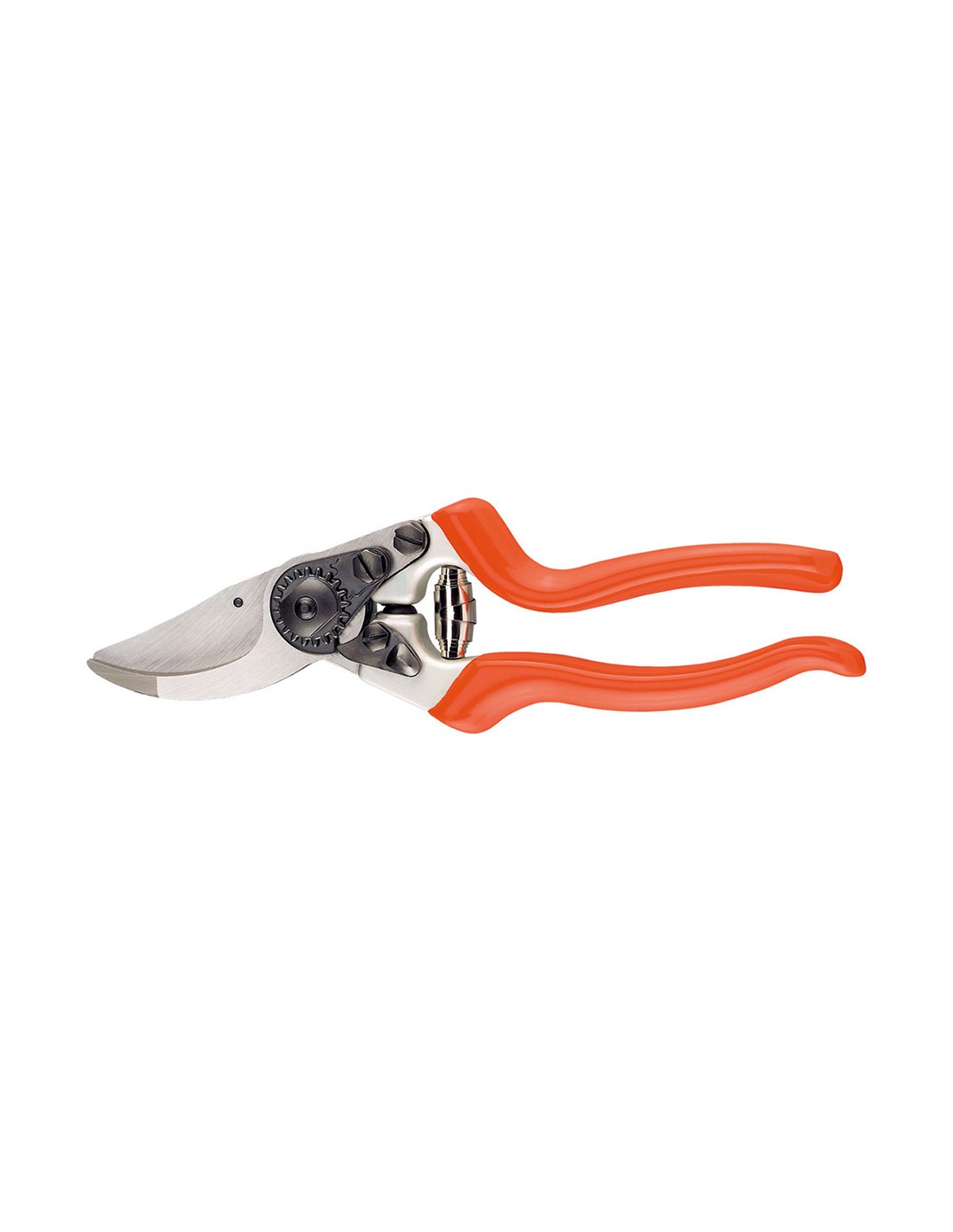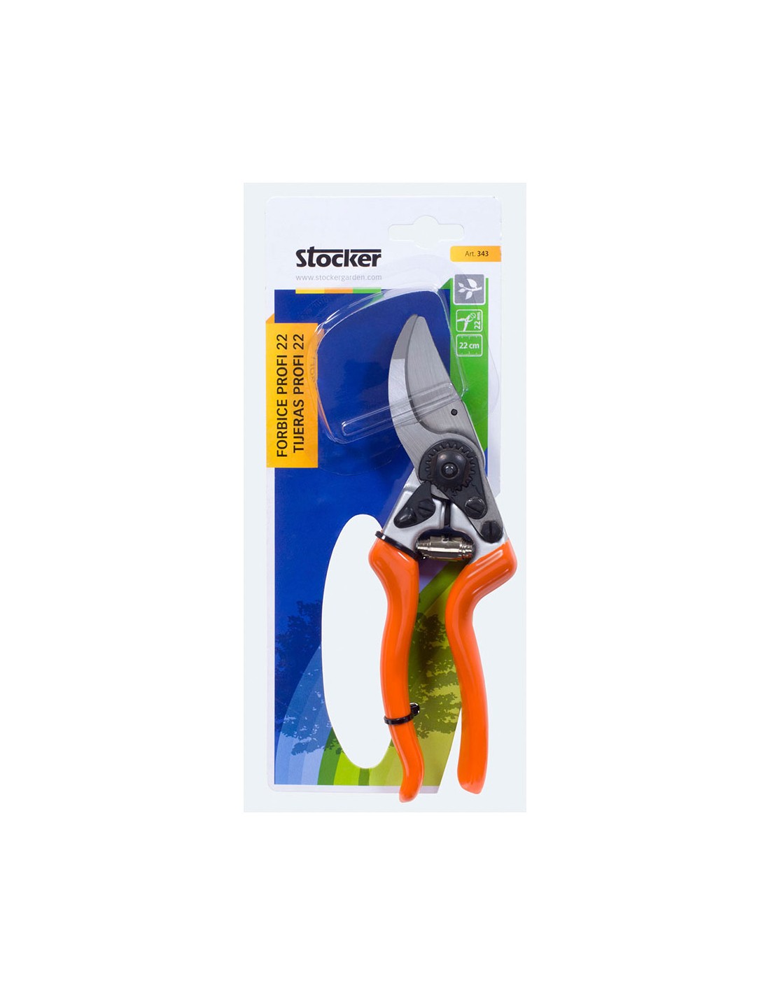 Tijera profi bypass 22. stocker. tijera con hoja y contra hoja curvada y corte bypass. ideal para un uso profesional y aficionados. la tecnología con bloqueo de seguridad garantiza una mayor estabilidad del bulón central. hoja de acero cromado. mangos de aluminio forjado revestidos de pvc. empuñadura ergonómica longitud: 22cm. peso: 250g diámetro máximo de corte: 22mm