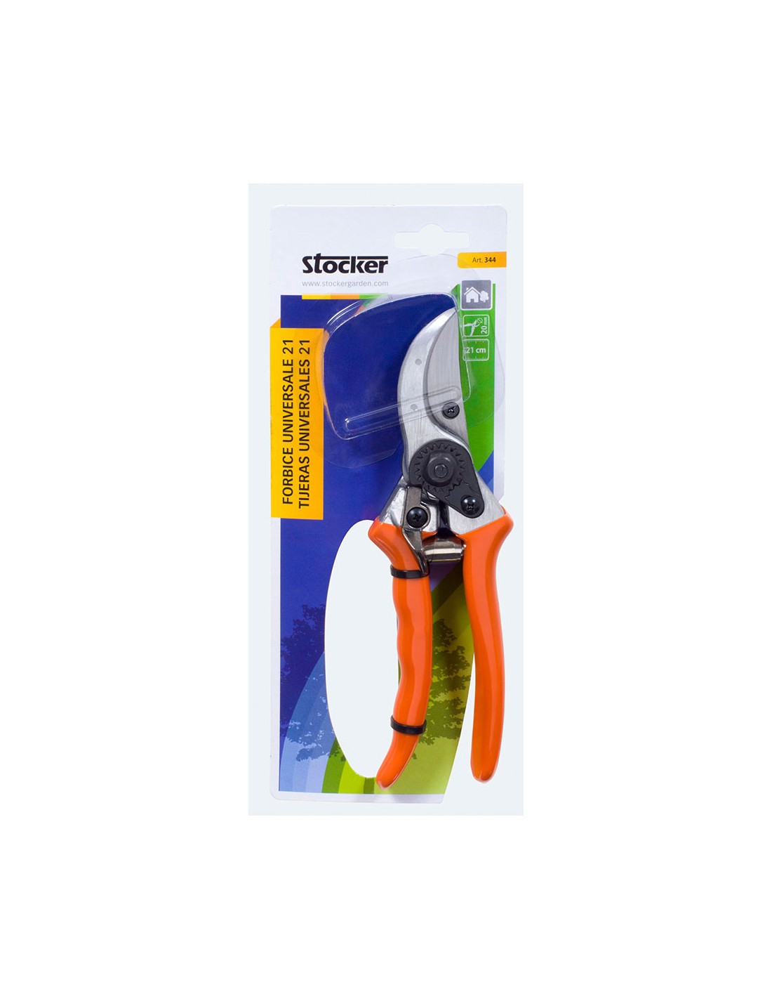 Tijera universal de jardín 21. stocker. tijera de jardín con corte pasante muy manejable y adapta a todos los usos. extremamente manejable y ligera. la hoja larga agiliza los trabajos de corte. empuñadura ergonómica de goma. longitud: 21cm peso: 266g