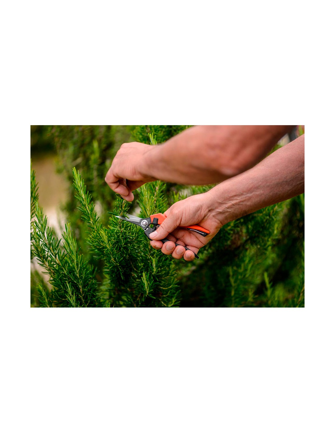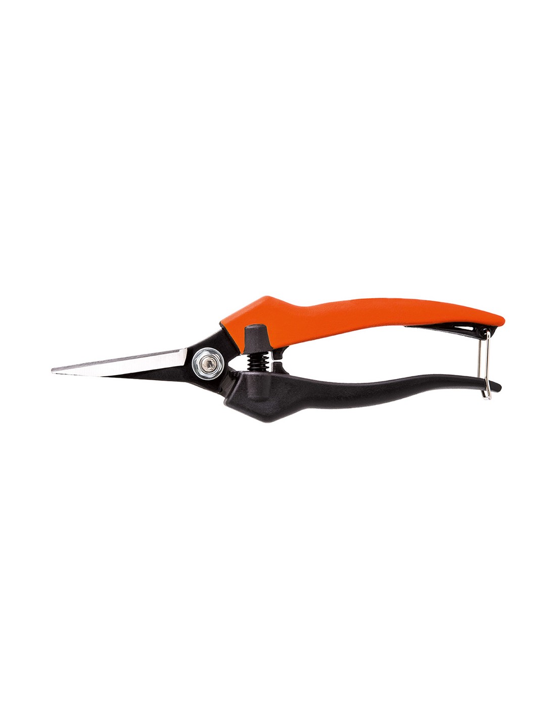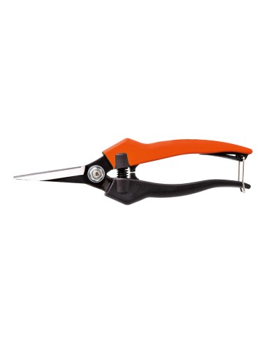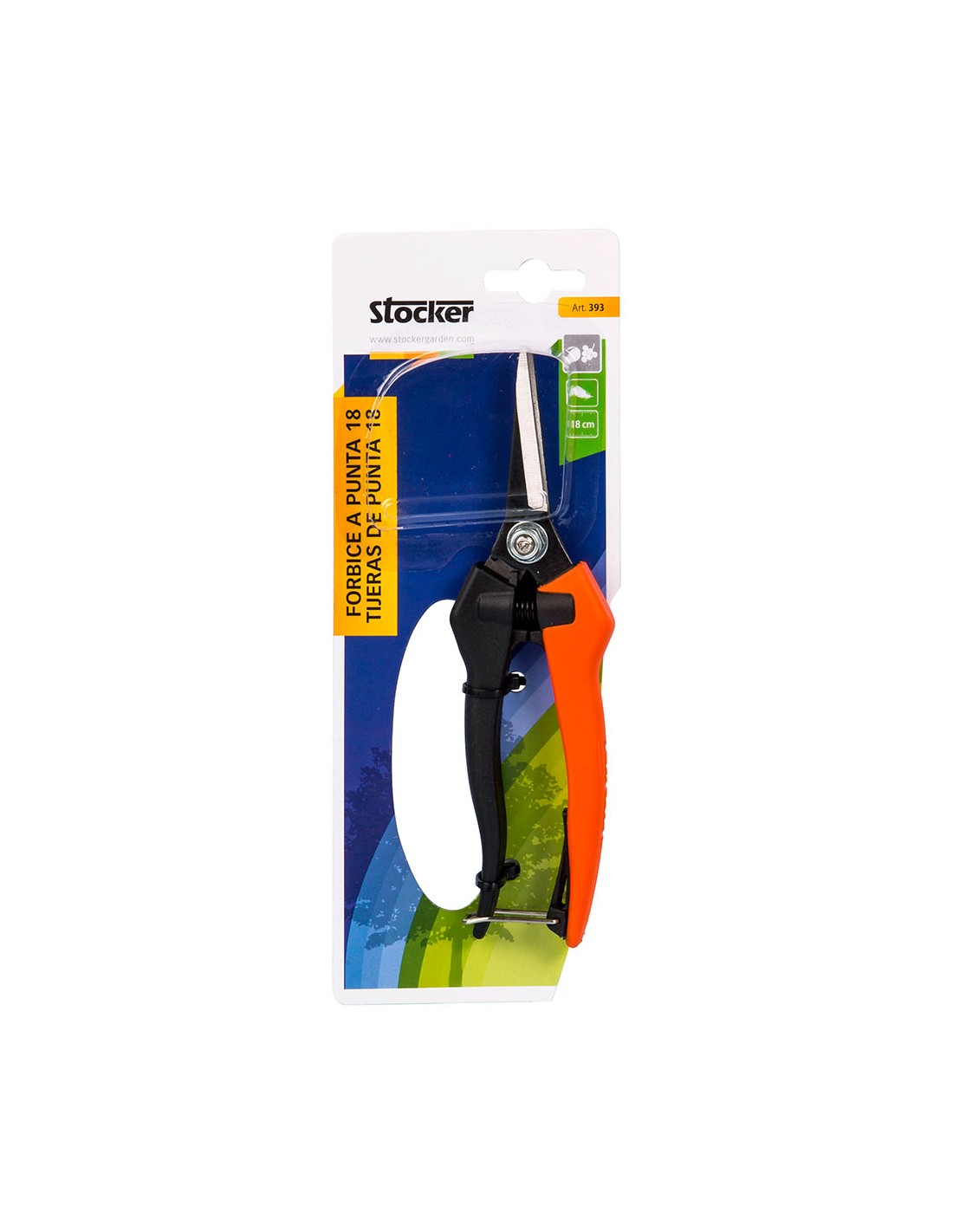 Tijera para vendimia de punta 18. stocker. compacta y ligera, perfecta para la vendimia y la recolección de frutos cítricos. hoja de acero forjado en caliente. mango de pvc. empuñadura ergonómica. longitud: 18cm peso: 90g