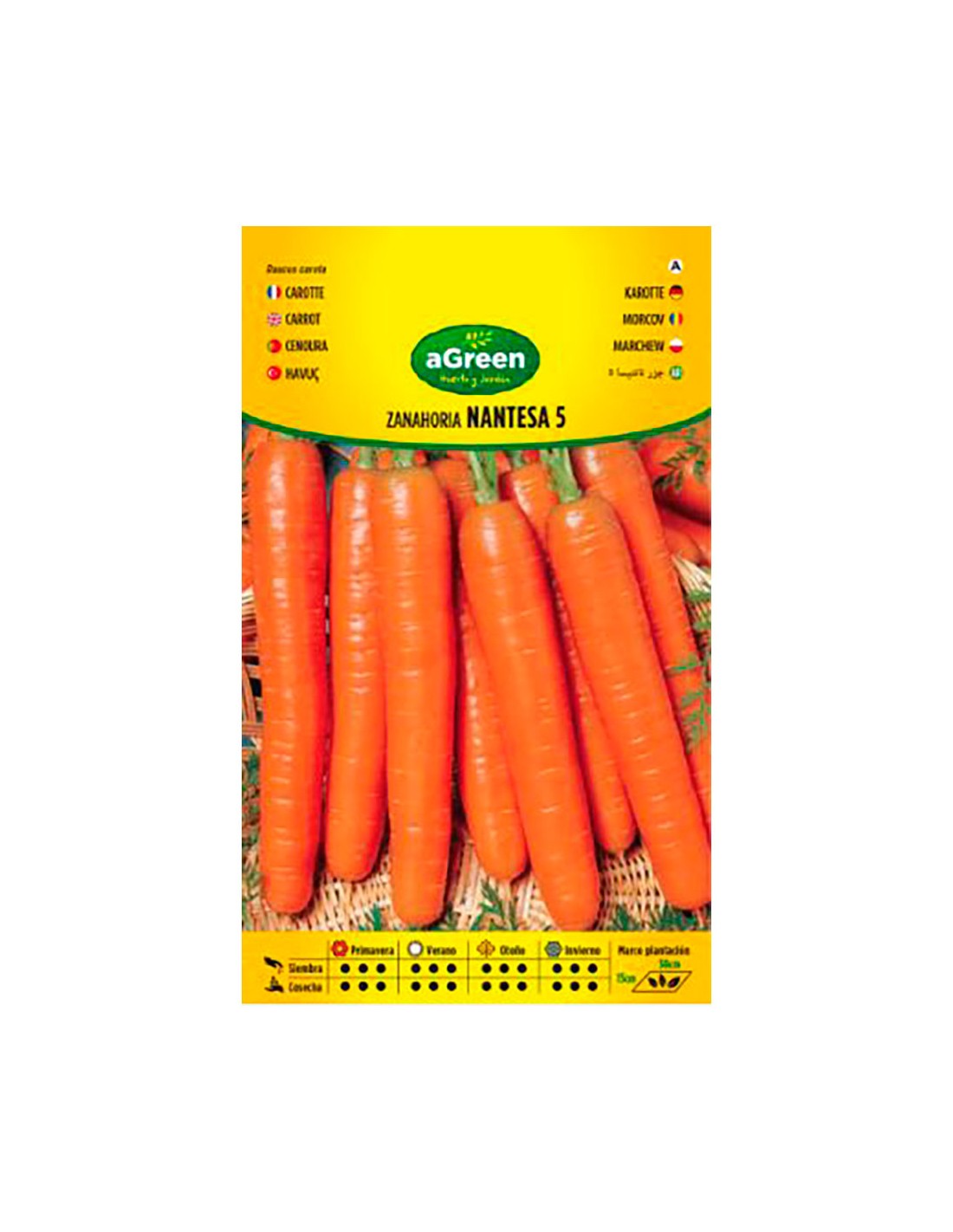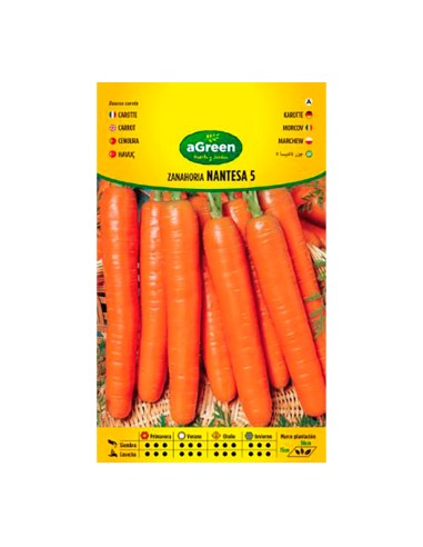 Sobre con semillas de zanahoria nantesa agreen. raíces bien formadas, sin corazón, muy dulces y de piel fina, color anaranjado intenso y dulce sabor.siembra todo el año con preferencia de febrero a mayo. recolección a los 3 ó 4 meses de su siembra.
