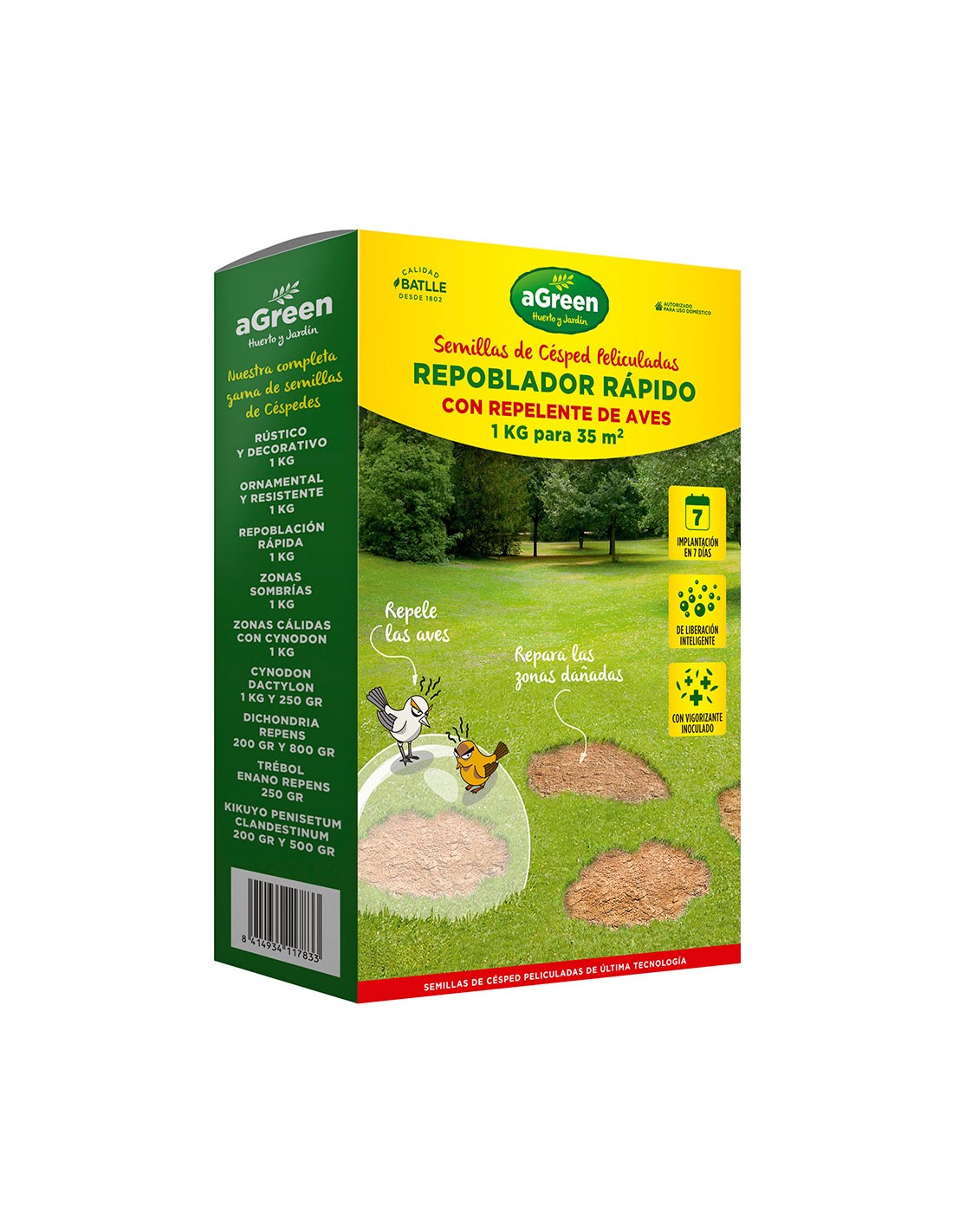 Césped repoblado rapido con repelente aves 1kg. agreen. repoblador rápido con repelente de aves, solucion ideal para recuperar los céspedes de forma rápida y duradera, protegiéndolos además de la incidencia de las aves. una formula que resupera en 7 días las zonas maltrechas del césped, incluyendo un fertilizante de libración controlada que asegura la nutrición hasta más de 100 días desde su siembra.