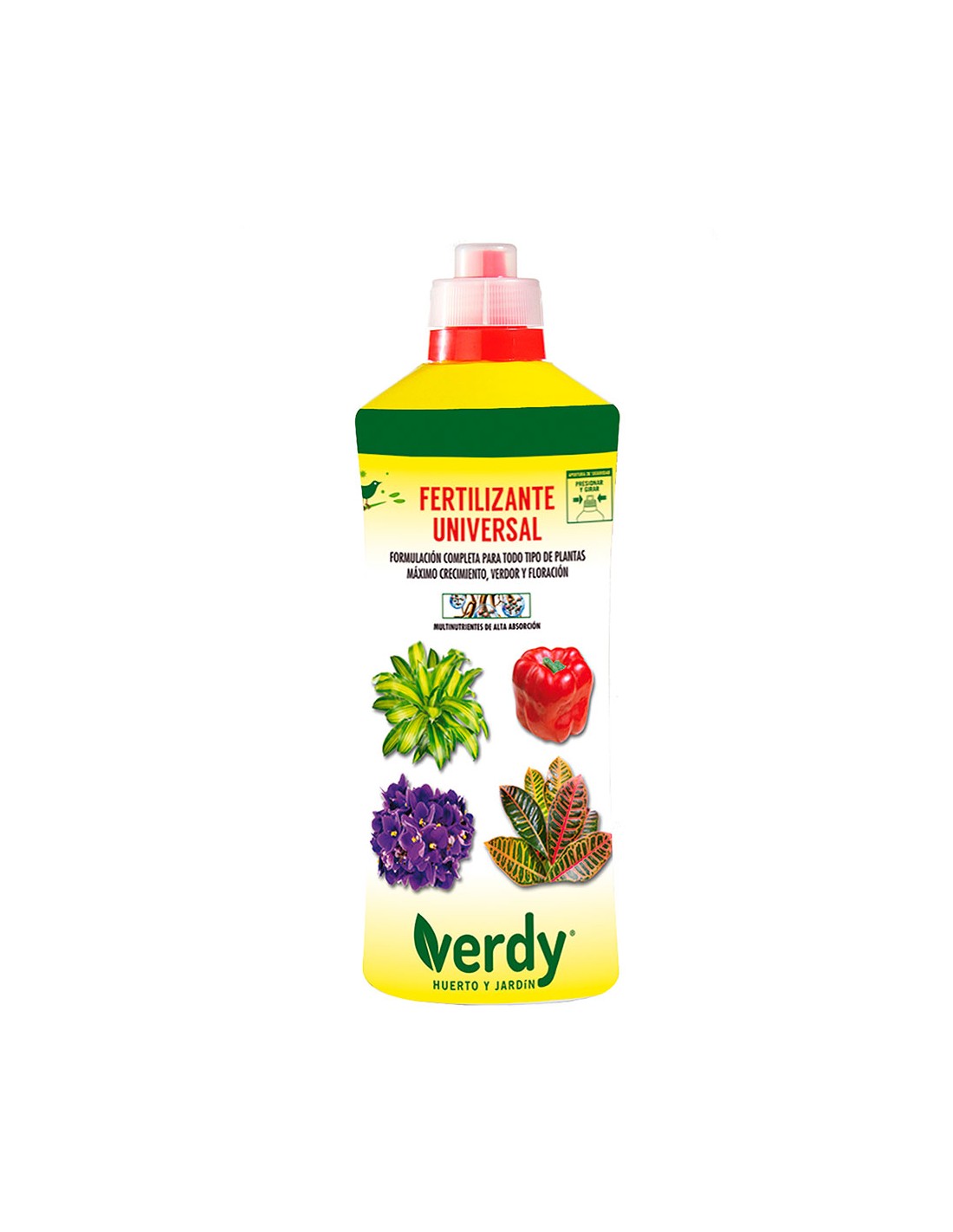 Fertilizante universal 1250ml. verdy. el fertilizante universal verdy es un complejo nutritivo de alta asimilación y rápida respuesta, formulado para aportar los nutrientes necesarios que permiten uncorrecto desarrollo, crecimiento y floración de cualquier tipo de planta en todaslas condiciones: interior, terraza y jardín. contiene una equilibrada relación demicronutrientes que mejoran el aspecto general de las plantas.