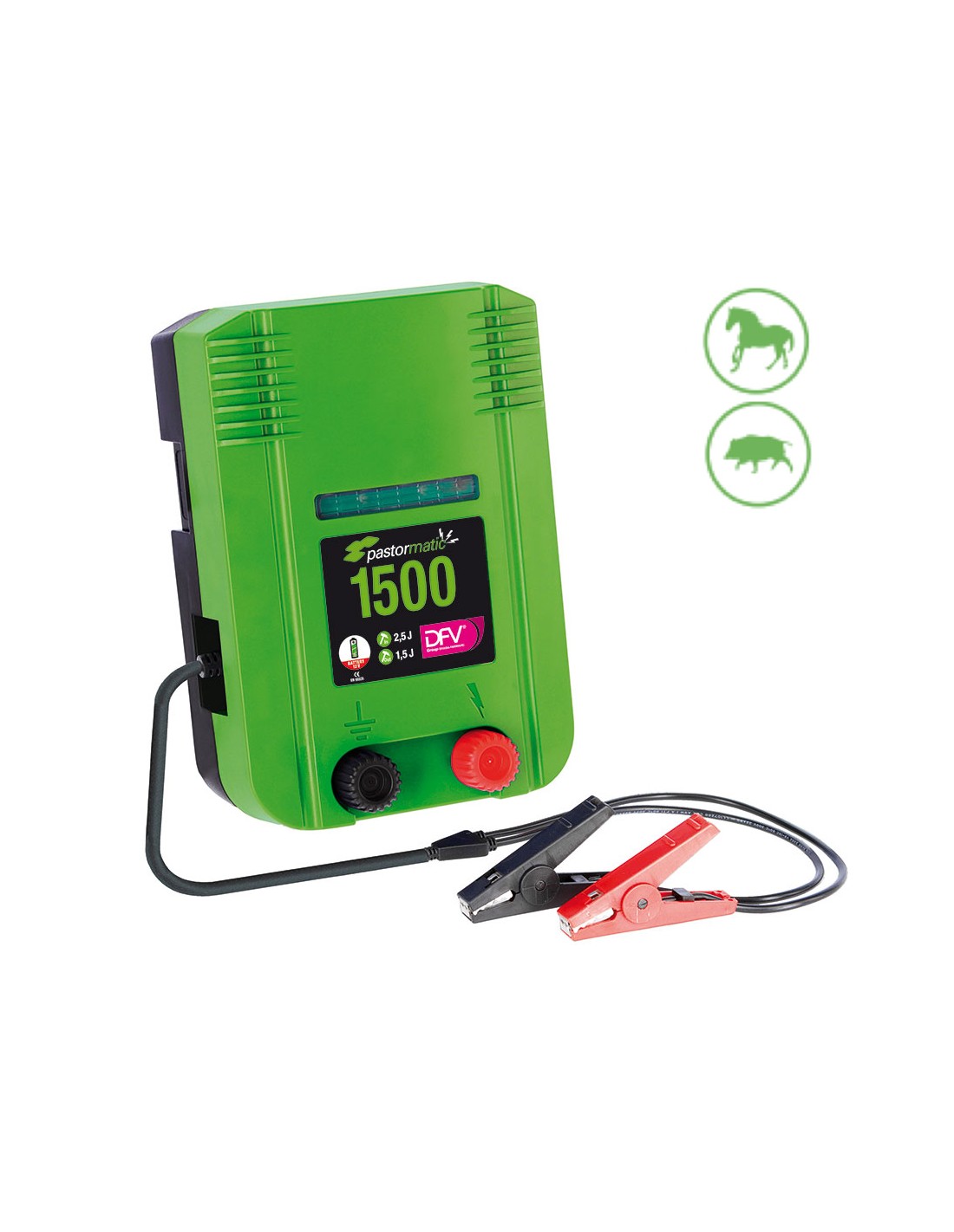 Pastor 1500 12v pastormatic. modelo a batería de 1 ,50j para cercas de hasta 15km. ideal para vacuno, ovino y protección de cultivos contra jabalíes. display led de buen funcionamiento. permite opción solar con panel solar de 8w y caja galvanizada para batería de 12v de hasta 55ah. incluye piqueta de tierra, placa señalización y tomas de tierra y línea. garantía 3 años. potencia almacenada 2,20j. potencia de salida 1,50j. voltaje máximo 10800v. voltaje a 500 ohm: 4700v. consumo 176ma/h. batería no incluida