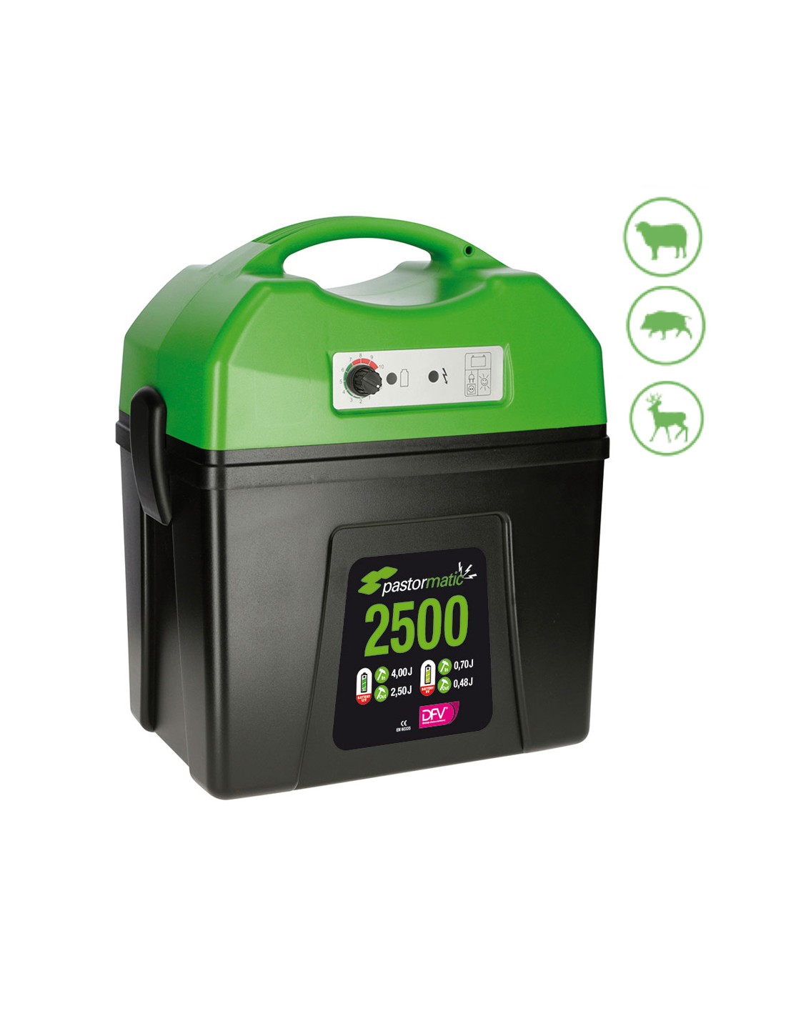 Pastor 2500 12v pastormatic. modelo muy potente de 4,80j a batería 12v. ideal para vacuno de montaña, ovejas, ciervos y protección de cultivos contra jabalíes. dispone de leds display con indicador estado batería y buen funcionamiento en la cerca. incluye selector de potencia con escala del 1 al 10. gracias a las grandes dimensiones de la caja inferior se puede almacenar una batería de coche en su interior. el pastor incluye conexiones para batería 12vy pila 9v, piqueta de tierra, placa señalización, tomas de tierra y línea. garantía 3 años. . conexión 12v. potencia almacenada 0,70j. potencia de salida 2,5j. voltaje máximo 10000v. voltaje a 500 ohm: 4500v. consumo 22-245ma/h. batería no incluida