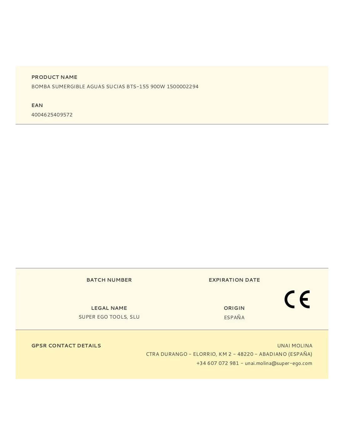 Bomba sumergible para aguas sucias bts-155 900w 1500002294 para extraer agua de depósitos y pozos, además de usarse en riego manual y automático. para su uso con aguas usadas que contienen partículas en suspensión, aguas de filtraciones o estancadas. equipada con: interruptor de boya para detectar el nivel del agua, cuerda para una fácil recuperación de la bomba, facilidad de conexión gracias a los 10 metros de cable que incluye, asa que facilita su transporte y uso en cualquier lugar. datos técnicos: caudal: 15.500 l/h, potencia: 900w, tensión: 230v/50hz, partículas: máx. ø35mm, profundidad máx.: 7m t máx. líquido: 35c, boquilla con dos conexiones para rosca: 1 y 1 1/2" y dos conexiones para manguera: 25cm y 32cm