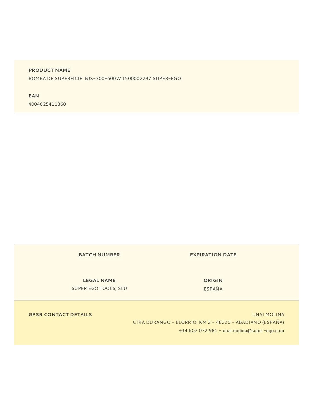 Bomba de superficie bjs-300-600w 1500002297 especialmente indicadas para su uso doméstico, jardín y riego. la bomba contiene una entrada de autoaspiración a la bomba y otra de expulsión. no usar en funcionamiento continuo ni con materiales abrasivos. características: carcasa con diseño especial resistente a los impactos. equipada con: asa que facilita su transporte y uso en cualquier lugar. datos técnicos: caudal: 3.000 l/h, potencia: 600w, tensión: 230v/50hz, cable: 10m, altura máx: 35m, altura máx. aspiración: 8m, roscas hembras en aspiración (1") y expulsión (1").temperatura máxima líquido: 35c. grosor máximo de las particulas aspiradas 1mm."