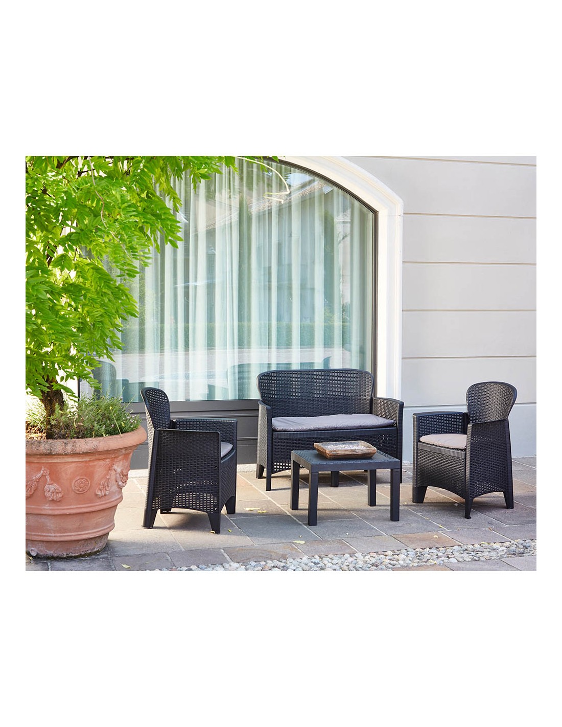 Set jungle con cojin jun06can ipae-progarden. set compuesto por sofa dos plazas y dos sillas de una plaza mas mesita baja efecto rattan color antracita 102x60x86cm