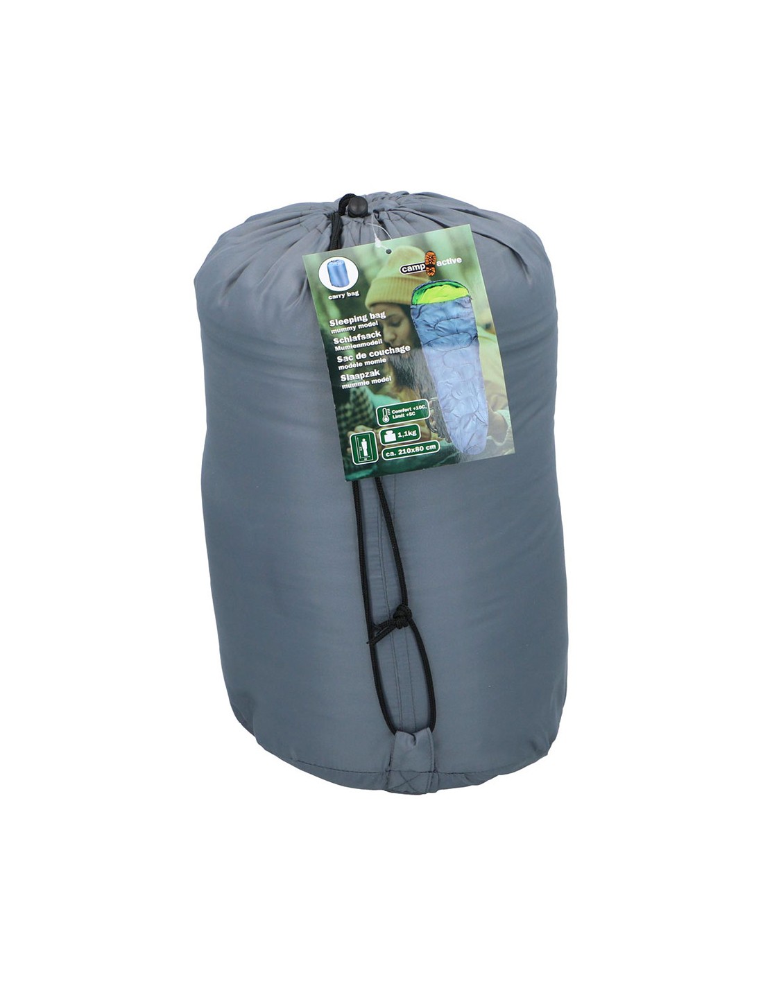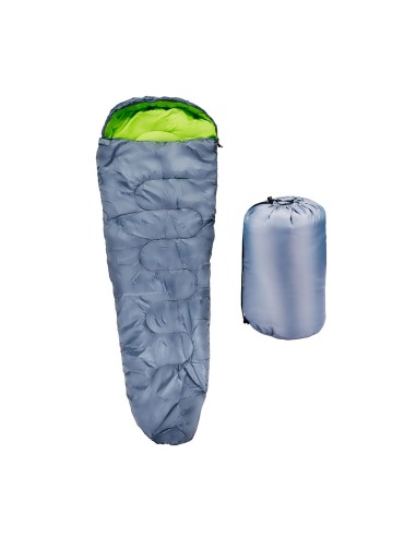 Saco de dormir gris, su interior es de color verde. confort + 10°c / limite + 5°c. dimensiones 210 x 80 cm