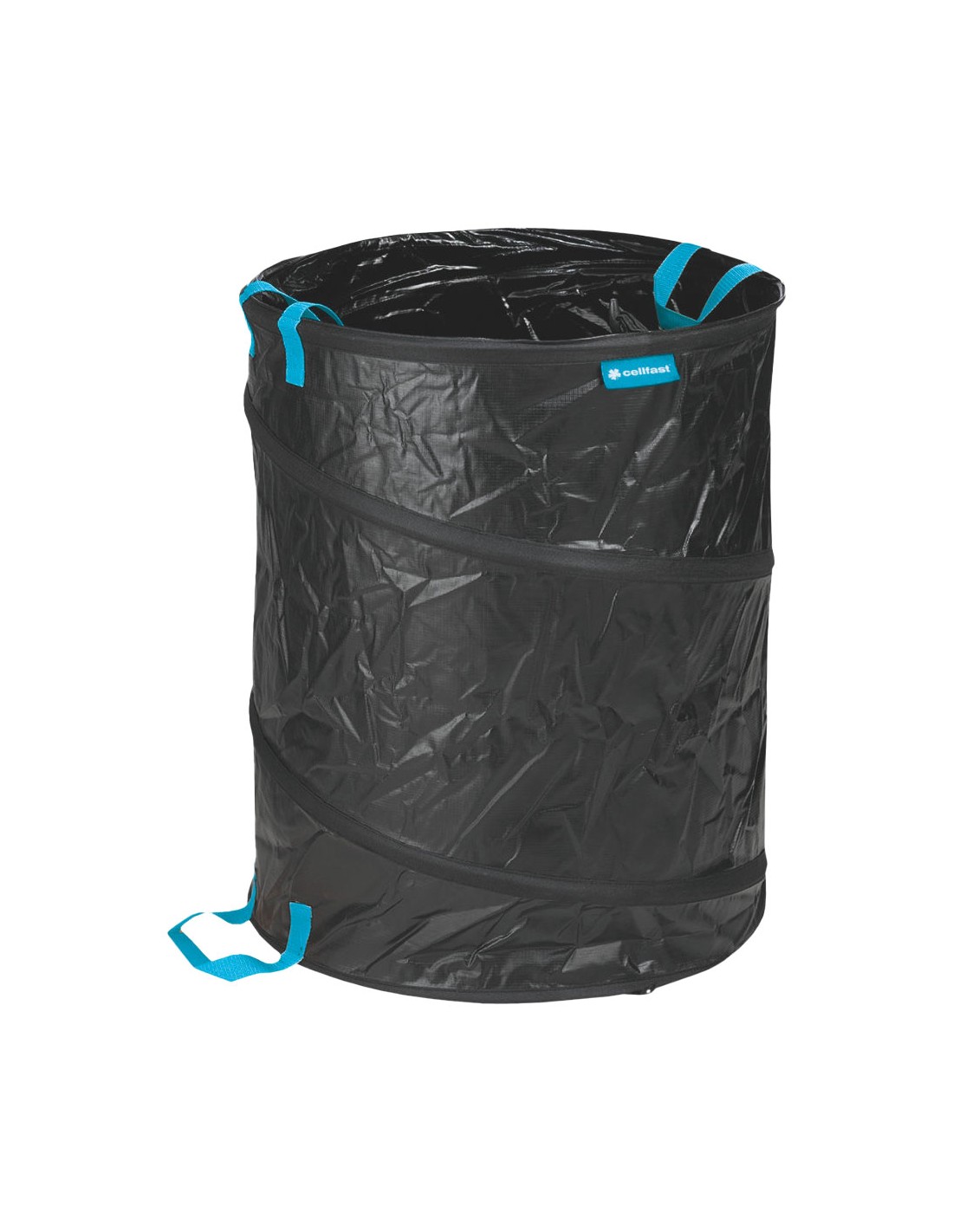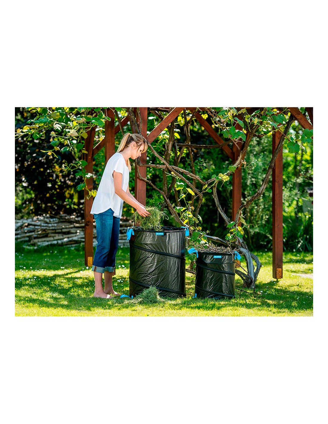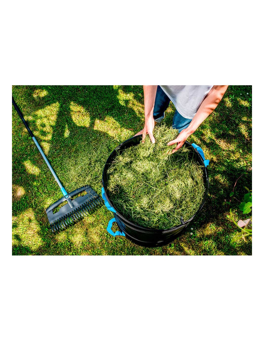 Cubo fabricado en nailon de alta resistencia y espiral de acero. desplegado tiene hasta 56 l de capacidad. muy ligero, impermeable al agua y resistente al desgarro. ø40 cm y 46 cm de altura desplegado (en sistema de almacenado/plegado tan solo 8 cm de alto). ideal para la recogida de hojas y poda. dispone de asas para el transporte