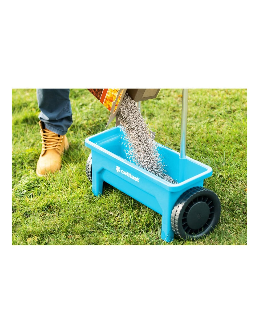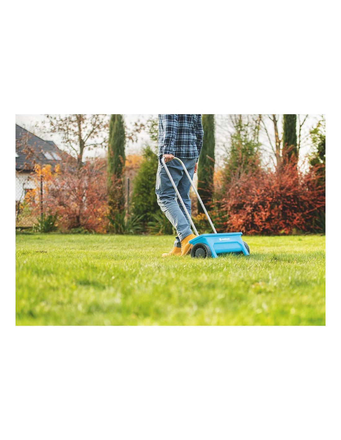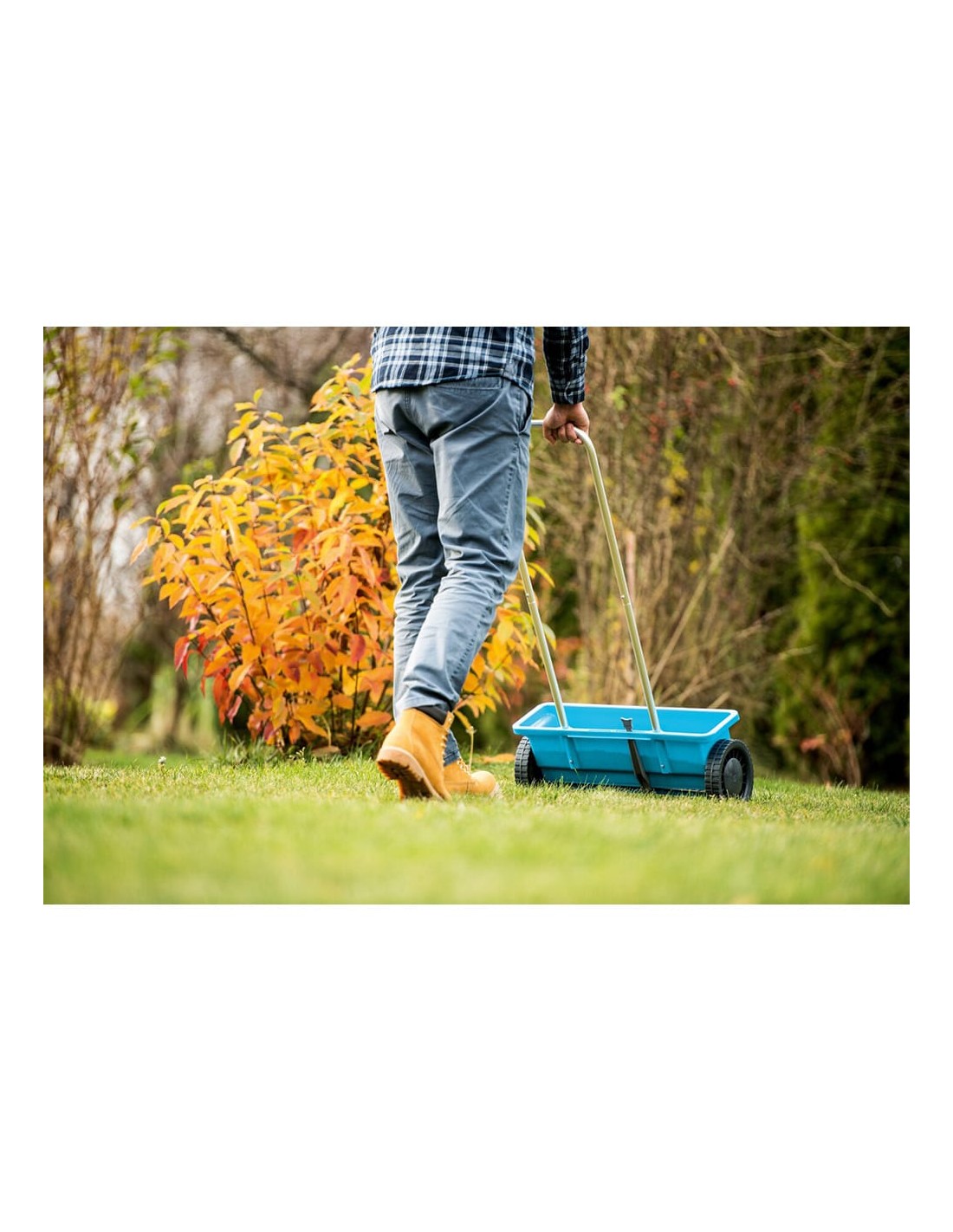 Esparcidor de jardín universal destinado a esparcir materiales con una granulación de 1 a 10 mm, puede utilizarse tanto en verano como en invierno. esparce el contenido del recipiente sólo durante el guiado. el rodillo garantiza una distribución uniforme del contenido, las ruedas de gran perfil facilitan el trabajo en superficies irregulares. anchura de esparcimiento de 45 cm, permite sembrar una gran superficie sin necesidad de rellenar el contenedor con frecuencia. capacidad de 12 l / 5,6 kg para semillas y 3 l / 8,1 kg para fertilizante granulado. 55,5 x 107 cm