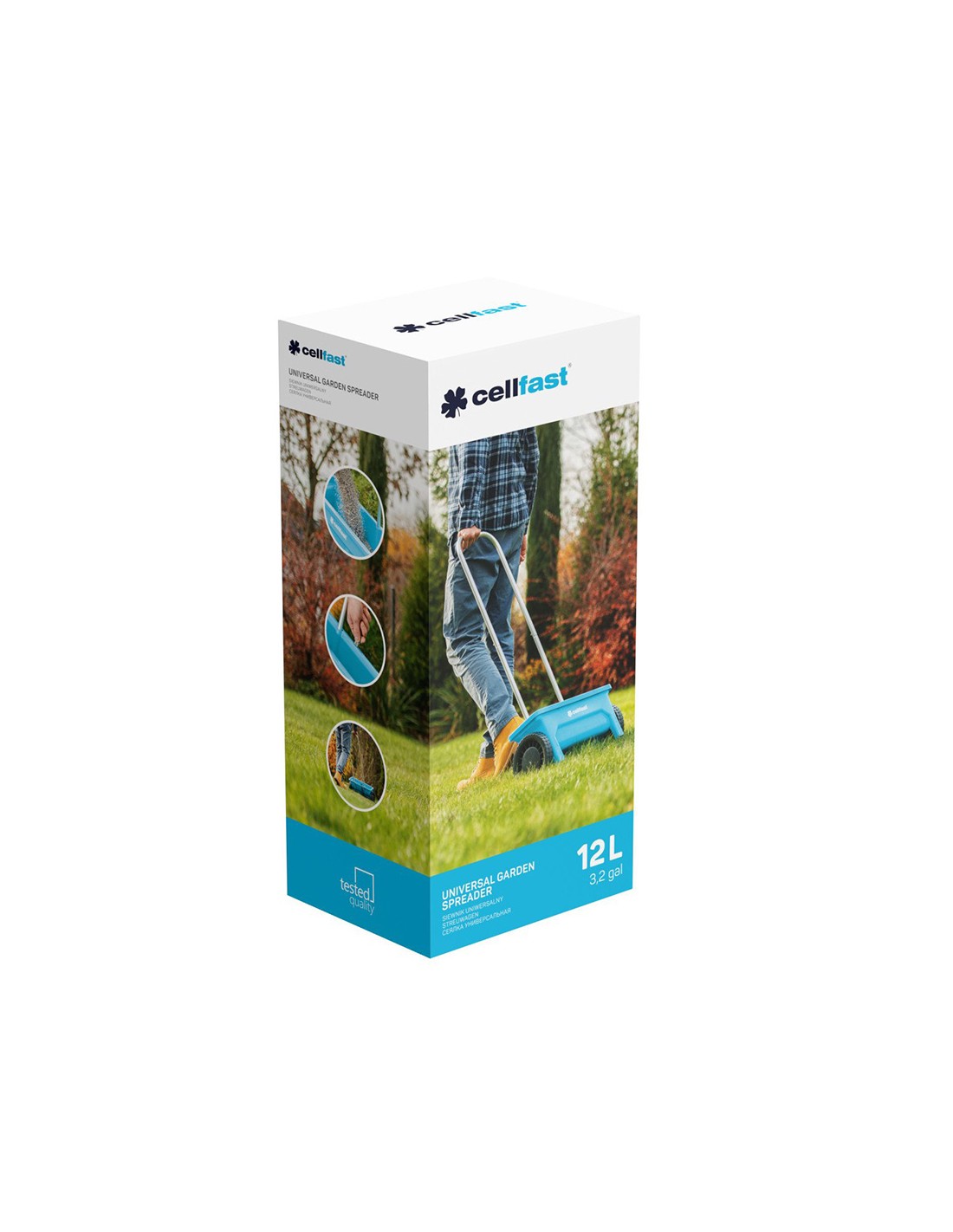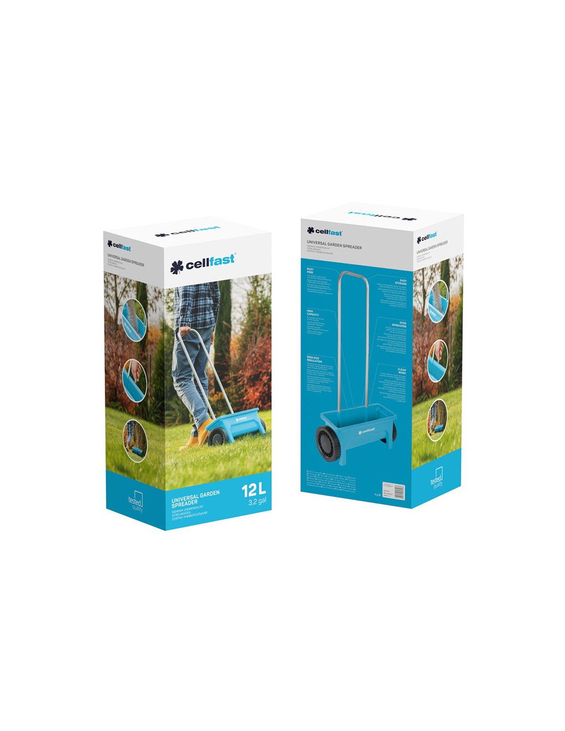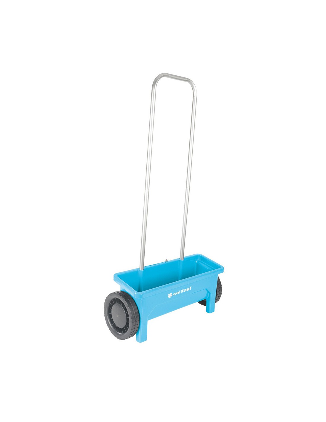 Esparcidor de jardín universal destinado a esparcir materiales con una granulación de 1 a 10 mm, puede utilizarse tanto en verano como en invierno. esparce el contenido del recipiente sólo durante el guiado. el rodillo garantiza una distribución uniforme del contenido, las ruedas de gran perfil facilitan el trabajo en superficies irregulares. anchura de esparcimiento de 45 cm, permite sembrar una gran superficie sin necesidad de rellenar el contenedor con frecuencia. capacidad de 12 l / 5,6 kg para semillas y 3 l / 8,1 kg para fertilizante granulado. 55,5 x 107 cm