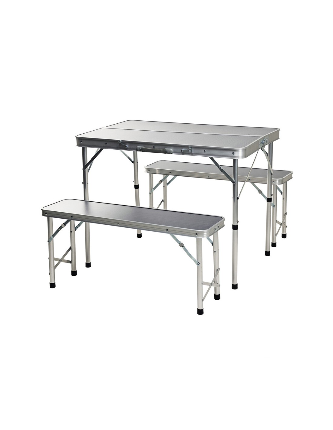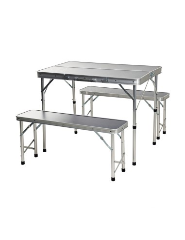 Conjunto de mesa con 2 bancos para cámping, resistente al agua mesa en raya gris con borde de 4,5 cm de grosor y patas de aluminio tamaño mesa 90 x 60 x 70 cm, carga máxima 30 kg bancos de 24 x 87 x 40 cm, carga máxima 90 kg las patas del banco y de la mesa ø25 x 0,6 mm de grosor