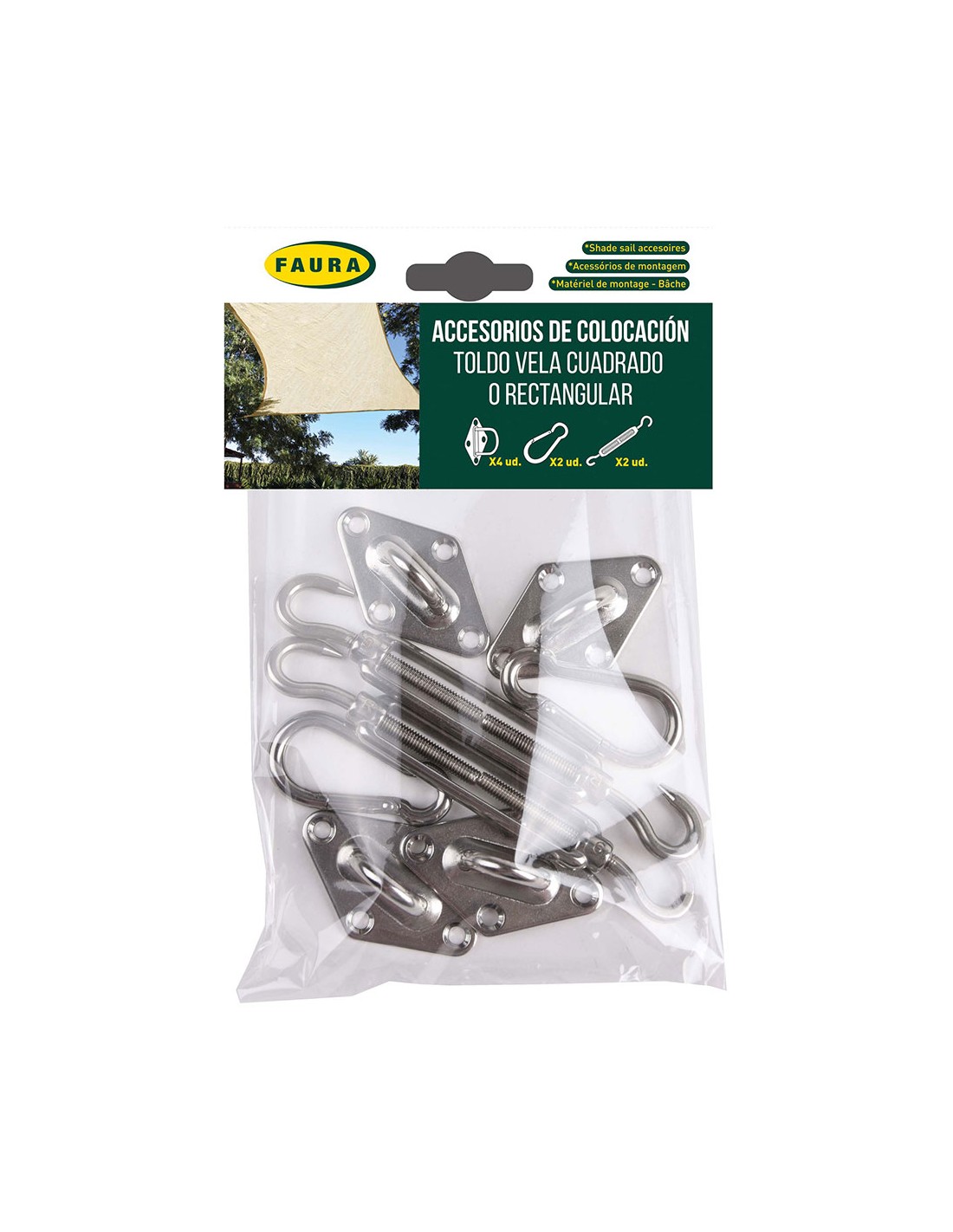 Accesorios de colocación, para toldo vela cuadrado o rectangular, contiene: 4 x fijación mural / 2 x mosquetónes / 2 x tensores. medidas: altura tensor 18,5 cm, mosquetón 6 cm y fijación mural 7,5 cm