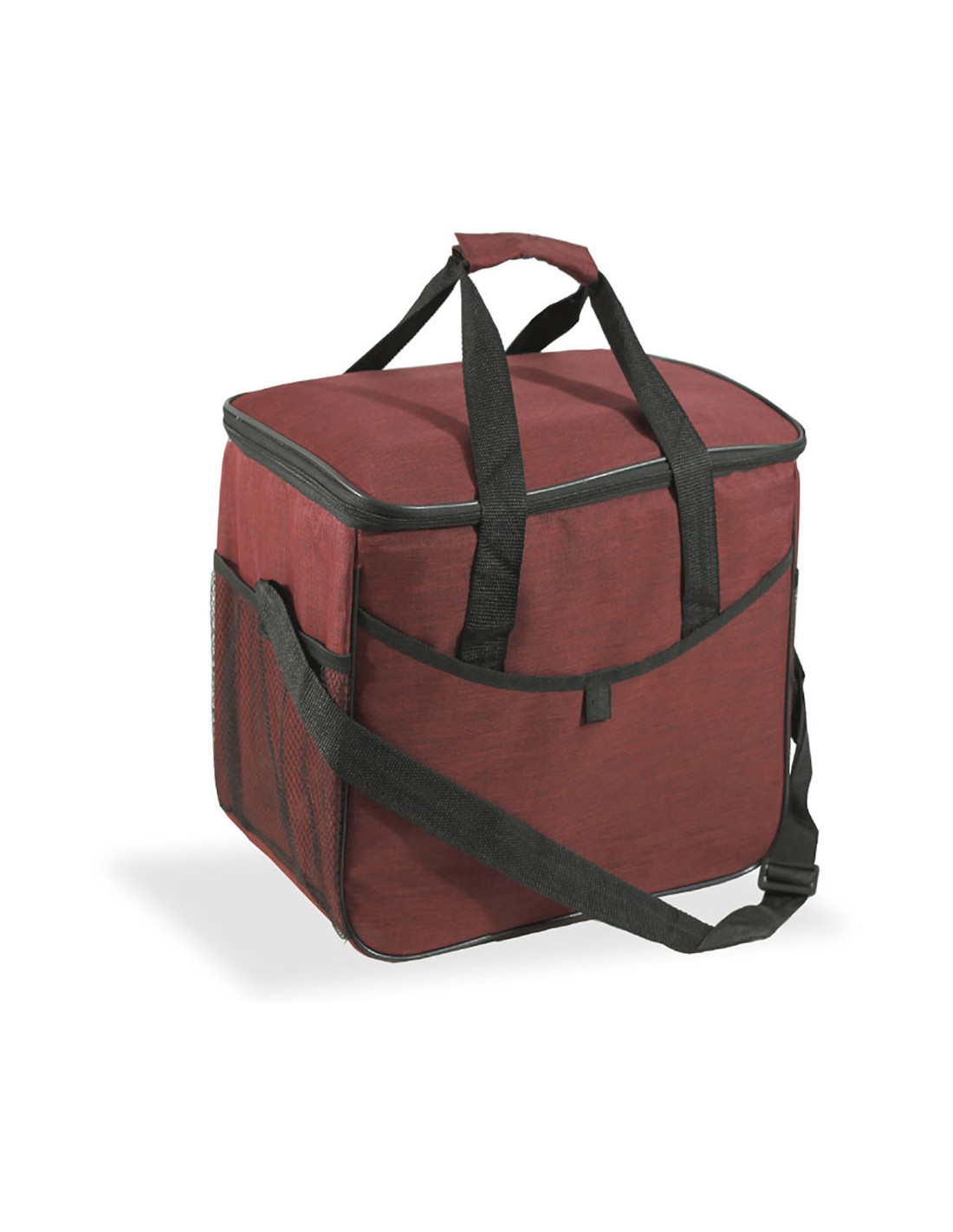 Nevera diseño tejana color granate, 21 l, con bolsillo frontal, asas y correa ajustable, con aislamiento de capa de alu film y plástico protector, revestimiento con isotérmico epe de 5 mm. medidas: 31,7 x 20 x 33 cm